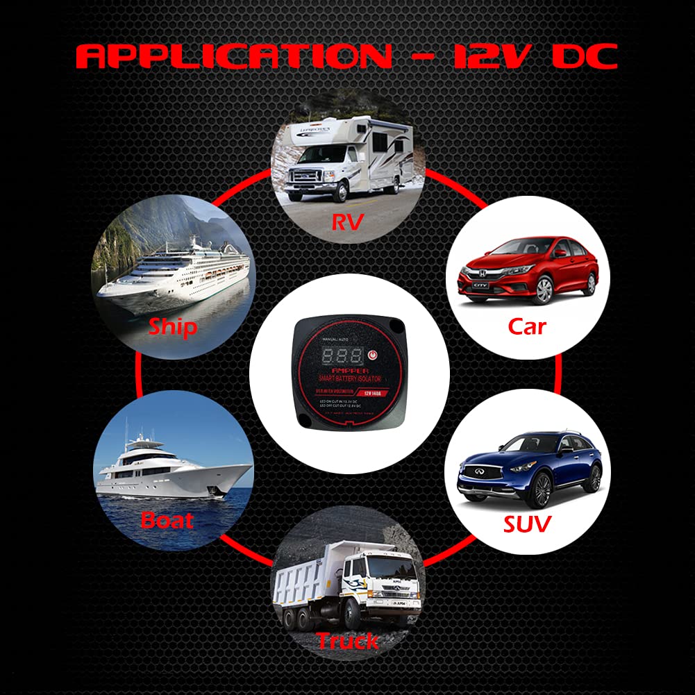 ‎universal used for car, vehicle, RV, ATV, UTV and boat, also two battery electrical equipment., Design for two battery systems, ensure your primary battery is always charged and ready to start your engine, heavy built to suitable for almost anywhere even off-road, with voltmeter and manual control button, cuts in at 13.3 volts and cuts out at 12.8 volts