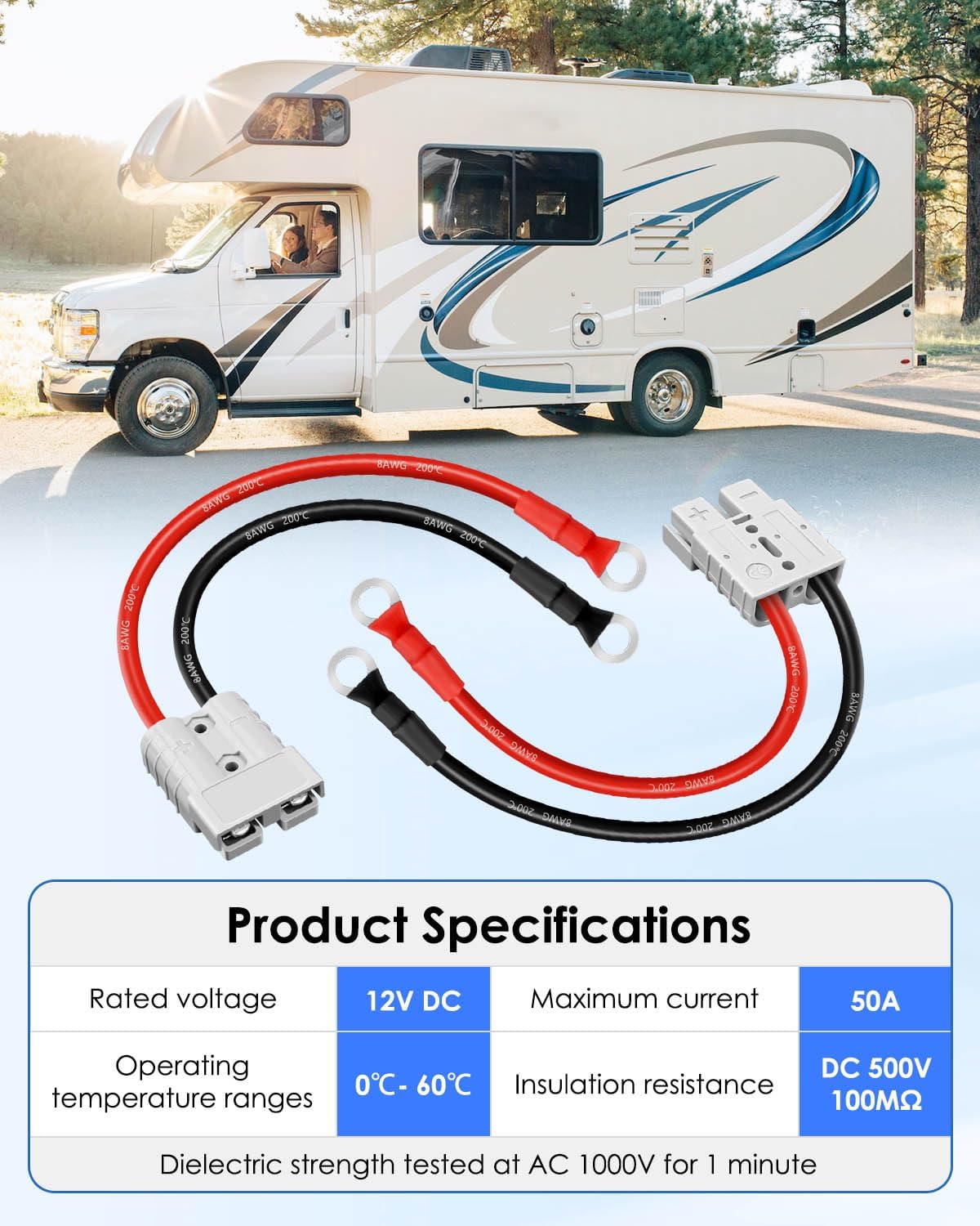 I got this kit to work with my many other 50A connectors. They fit well and have heavy leads with clean ring terminal connections. So if you are looking for 50A connectors with 8 AWG wire, this is the kit for you!