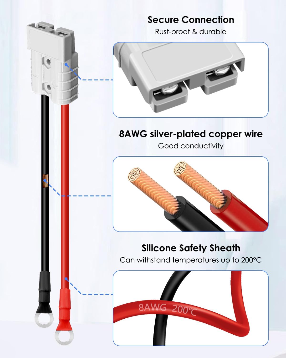 I got this kit to work with my many other 50A connectors. They fit well and have heavy leads with clean ring terminal connections. So if you are looking for 50A connectors with 8 AWG wire, this is the kit for you!