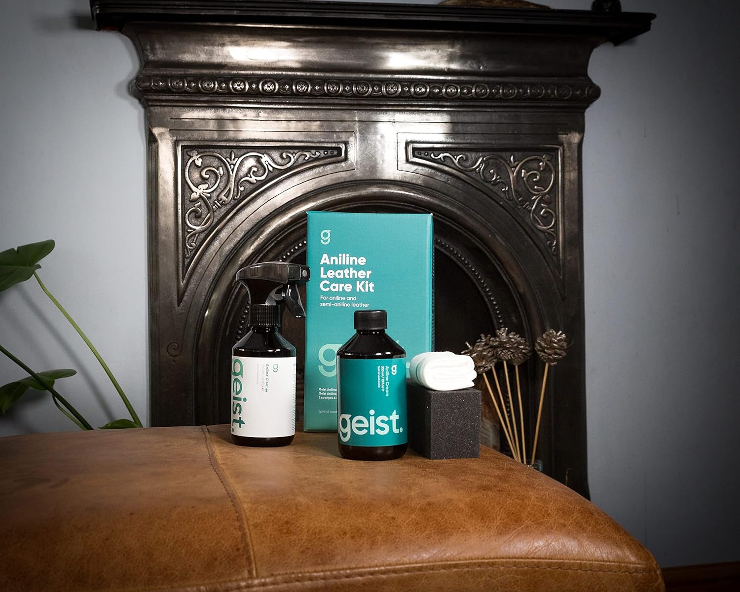 Geist leather care kit comes with cleaner, cream, two spongers, and two soft cleaning cloths. It is designed to clean Aniline leather, which does not contain a top coat on the finished product, which means it is porous and makes it more likely to stain and age in a less attractive way than top-grain leather.