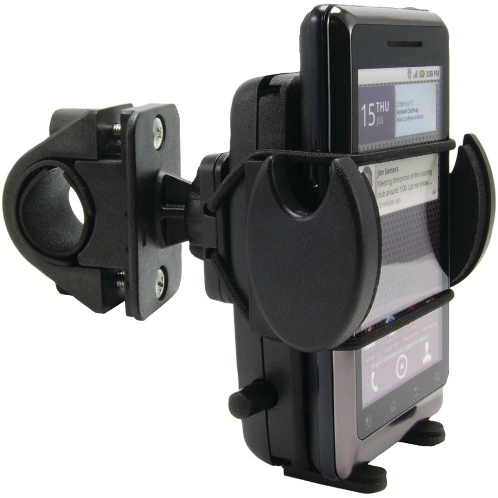 The item looked a little cheap but went right onto the handlebars of my large V-twin motorcycle. It has little rubber spacers so that it fits a variety of handlebar sizes; I was skeptical that it would hold considering my bars are significantly smaller in diameter than the mounting clamps. Anyhow, screwed it on and rode 380 miles without any adjustment and the mount held without budging. I can see that it cold weather, the plastic knob could be vulnerable to breakage — especially if you grab the thing and try to move it — so time will tell. The mount has a nice angle to it so I don’t see any need to move the phone once it’s in a satisfactory position. The mechanical clamps hold my phone tight — I tried it out by mounting the phone and swinging the mounting unit around and trying to throw off my phone — but it held tight with no movement. The bungee cord is just extra insurance against loss. I have no reason to doubt the durability of this unit and would recommend it to a friend. For reference, I have one of the smaller smart phones: an LG34C Optimus Fuel. But a larger phone would also work as the mechanical clamps spread quite wide.