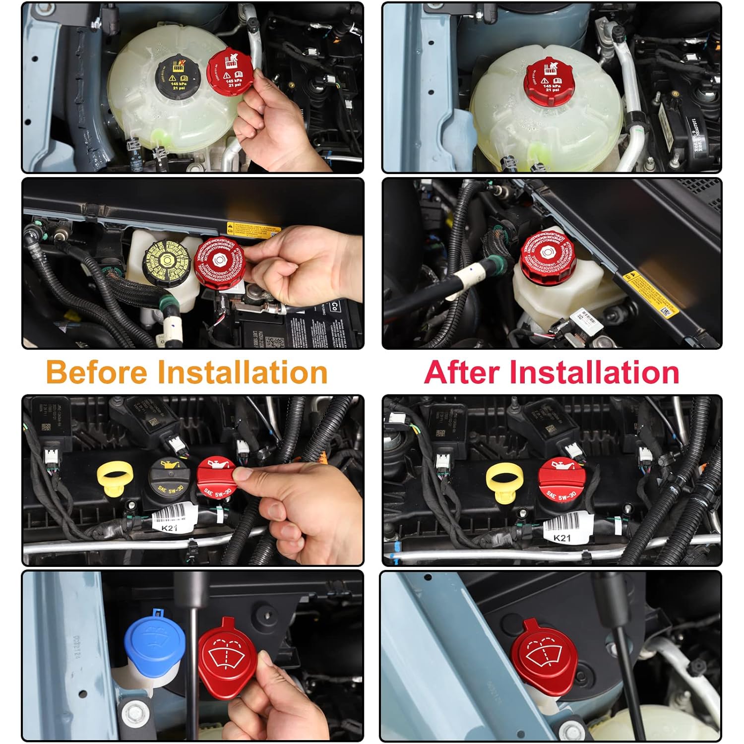 A instalação do conjunto de tampas de óleo do motor é simples e prática. Com um design autoadesivo, basta remover a fita 3M na parte de trás do produto para instalar. Para melhores resultados, recomenda-se limpar a área de instalação previamente, aquecer levemente a fita adesiva com um secador de cabelo e pressionar firmemente para garantir uma boa aderência.
