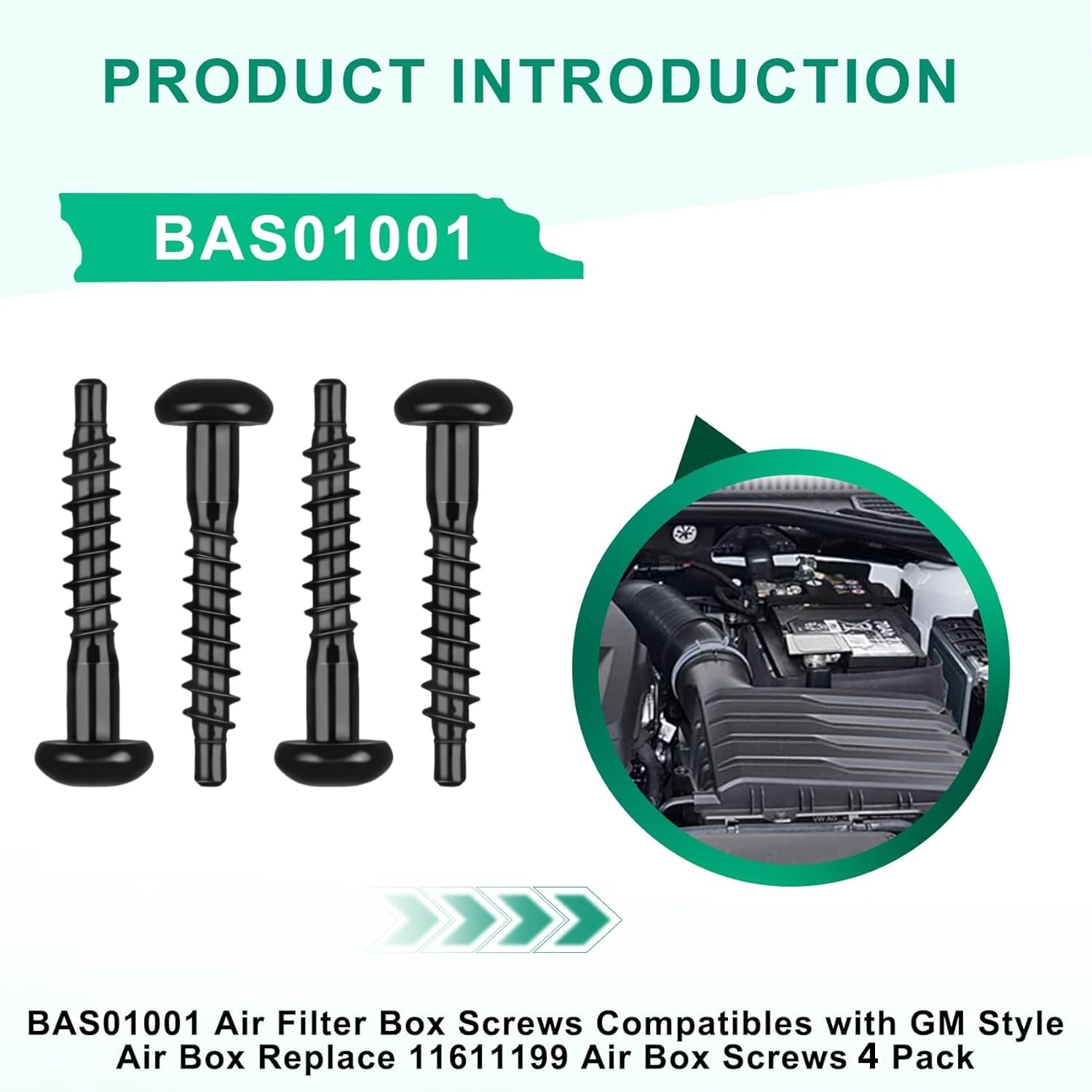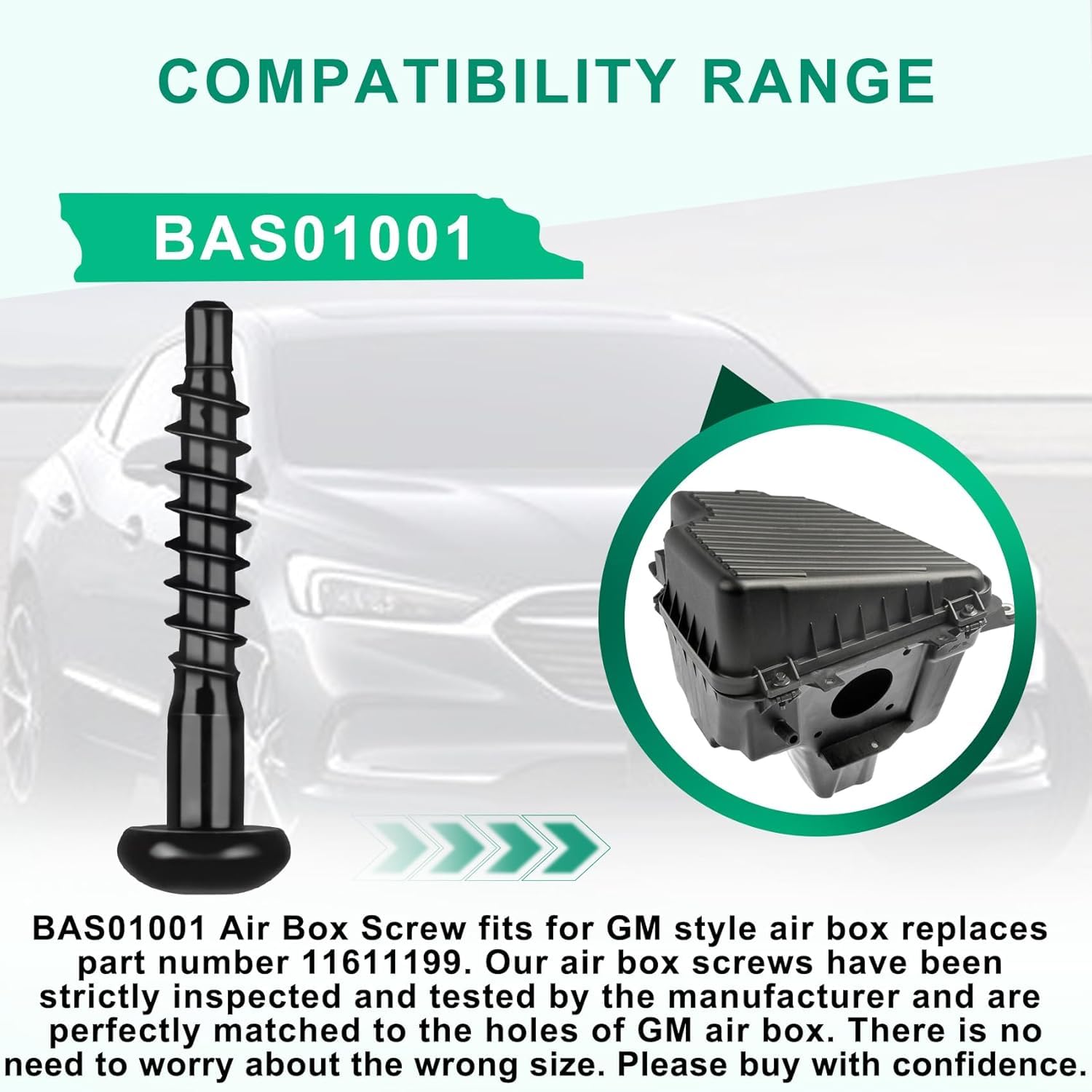 Os parafusos BAS01001 são compatíveis com caixas de ar do estilo GM e são utilizados para substituir o número da peça 11611199. Eles são adequados para uma ampla gama de modelos, incluindo, mas não se limitando a: 2015 Silverado, 2010 Equinox, Chevy Equinox 2.4L, 2020 Buick Enclave, 2011 Silverado, 2016 Traverse, 2009 Silverado, Sonic LT 2016, 2014 Chevy Traverse, 2008 GMC Yukon XL Denali, 2008 Silverado, 2012 Silverado 5.3L LT 4×4, 2017 Chevy Traverse LT, 2012 GMC Sierra 1500 SLE, 2011 Chevy Tahoe, Buick Enclave 2010, 2013 Chevy Sonic e 2010 2.4L Chevy Equinox.