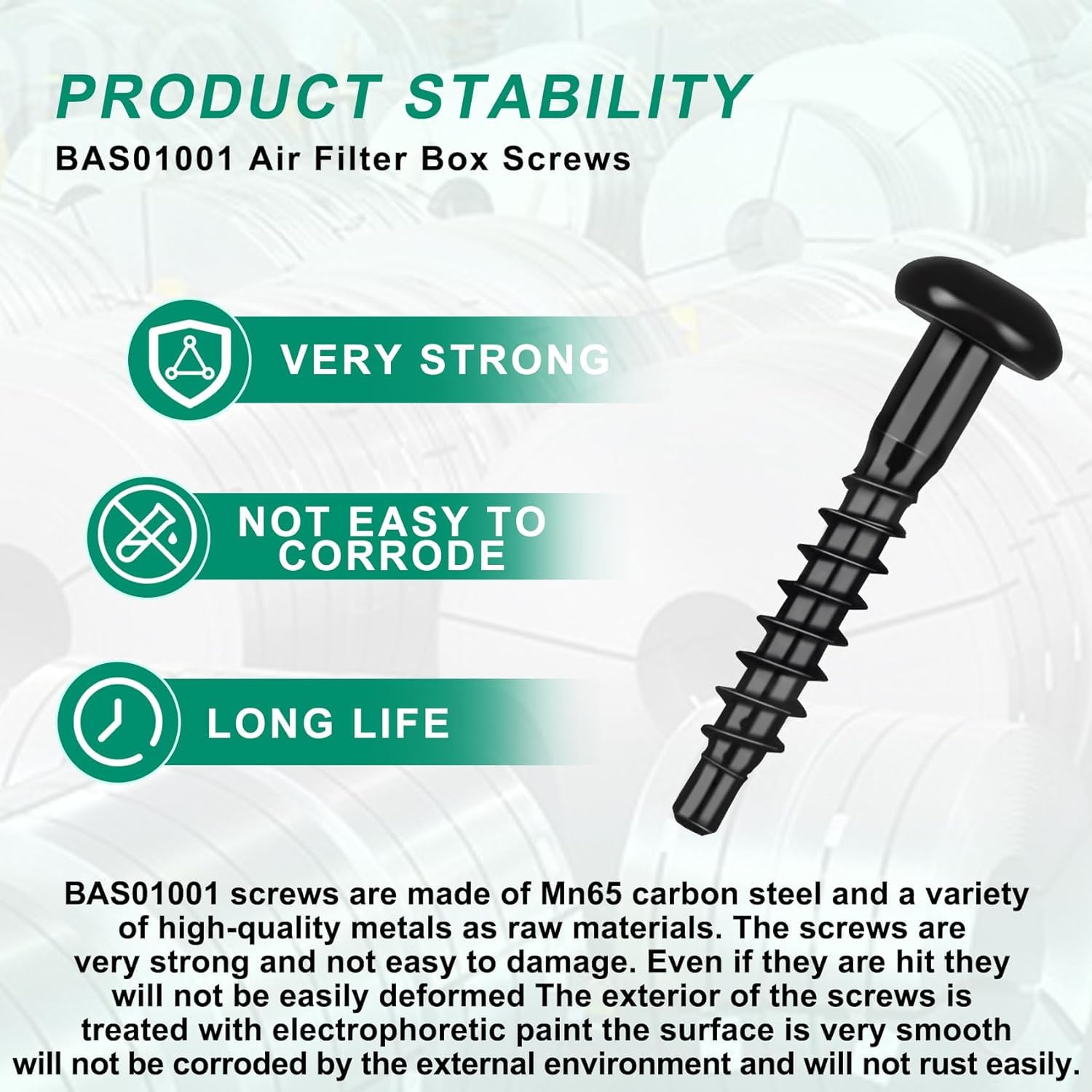 Os parafusos BAS01001 são fabricados em metal de alta qualidade, com um acabamento galvanizado que proporciona resistência à corrosão e durabilidade. O design exclusivo da rosca dos parafusos assegura uma melhor estabilização da caixa do filtro de ar, garantindo que o efeito de filtragem seja otimizado.