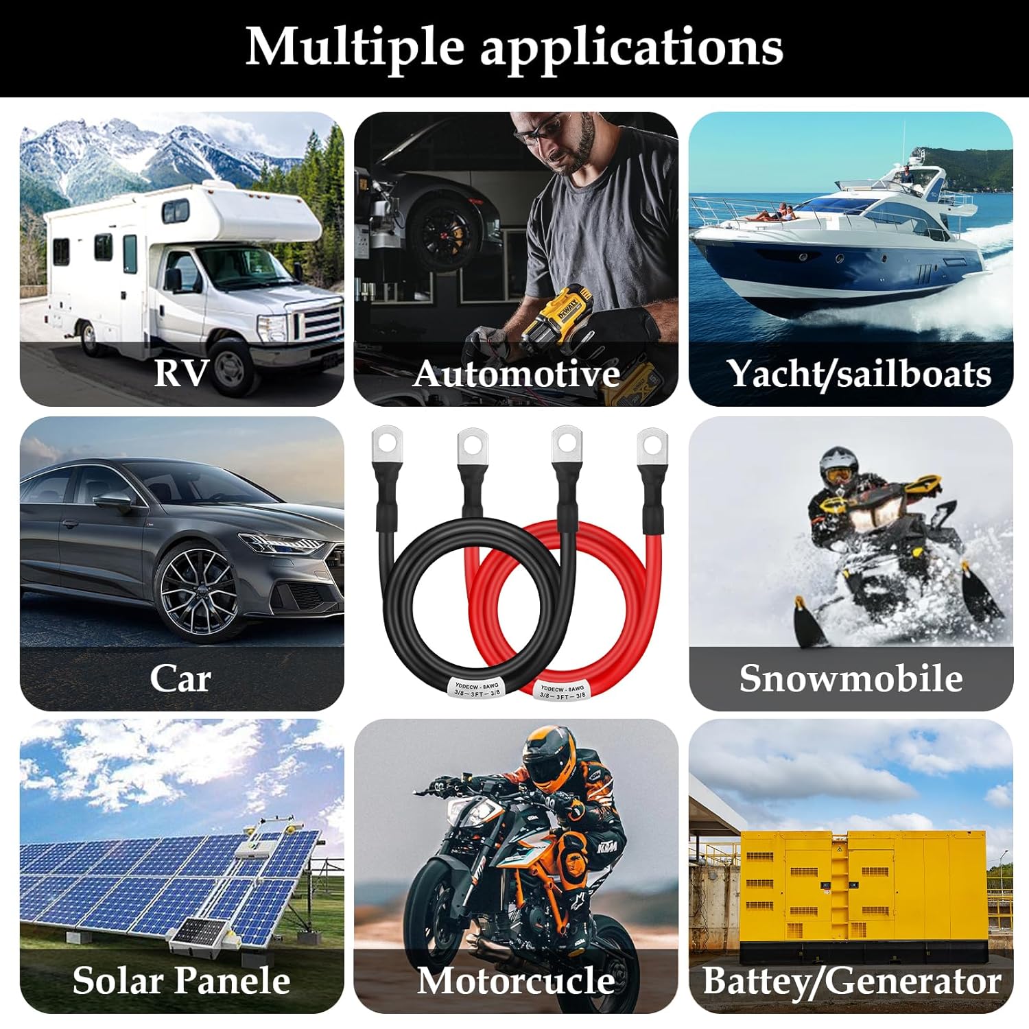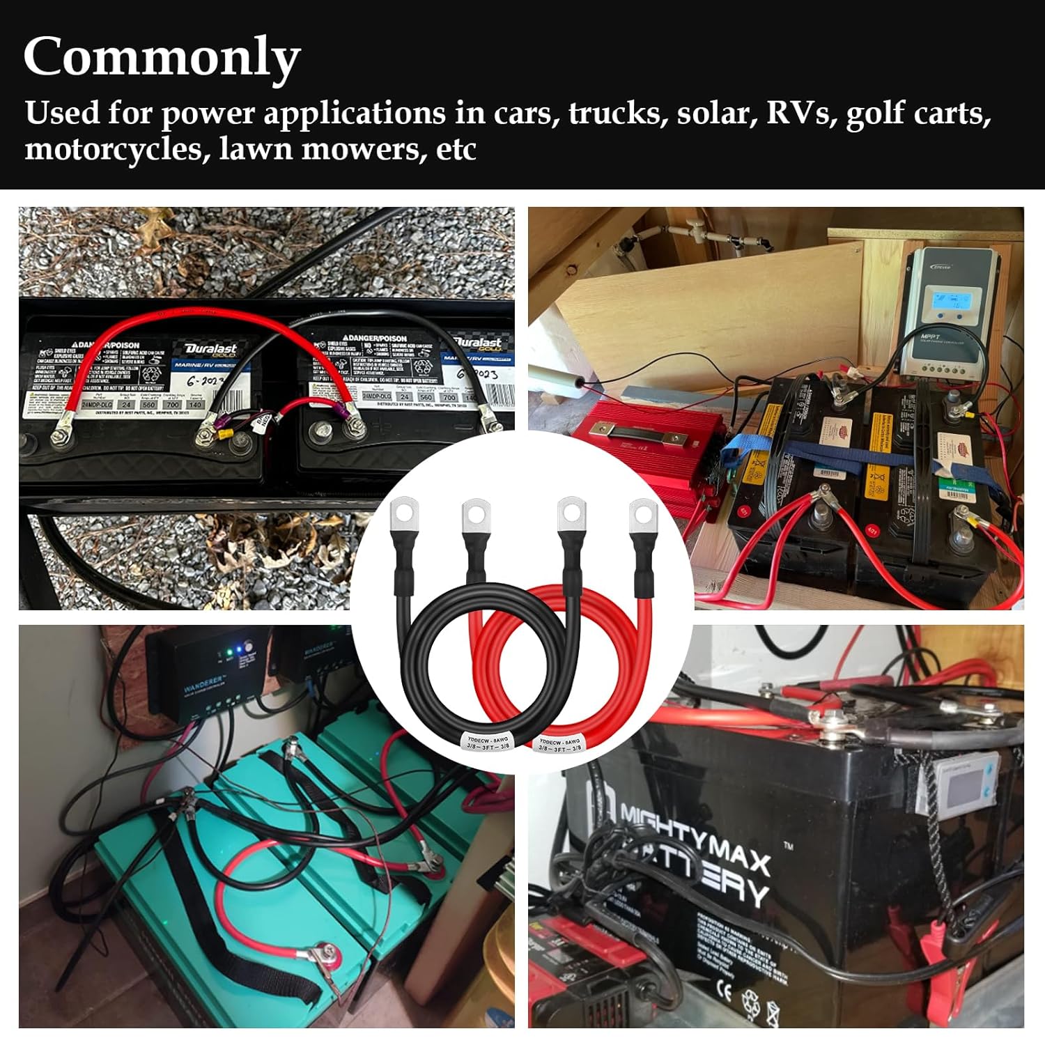 Este cabo é amplamente utilizado em aplicações de energia em carros, caminhões, sistemas solares, veículos recreativos (RVs), carrinhos de golfe, motocicletas, cortadores de grama, entre outros. O pacote inclui 2 cabos de bateria de 3FT (1 preto e 1 vermelho), proporcionando uma solução completa para suas necessidades de conexão elétrica.