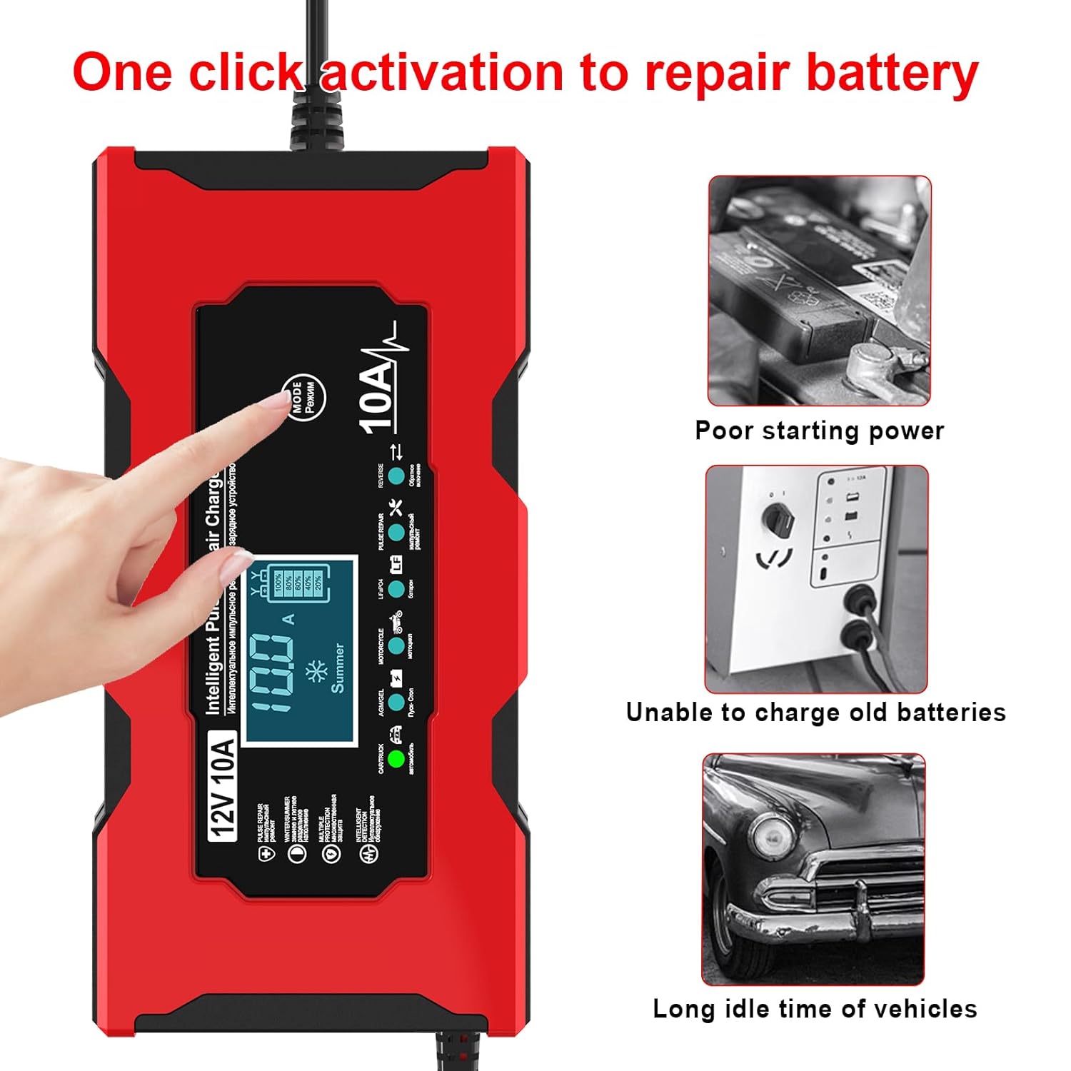 Além disso, o carregador possui uma função de reparo por pulso de alta eficiência, que detecta automaticamente a sulfatação da bateria e a estratificação do ácido, restaurando o desempenho perdido e garantindo partidas mais fortes do motor. É importante ressaltar que ele não pode ativar ou carregar baterias totalmente descarregadas.