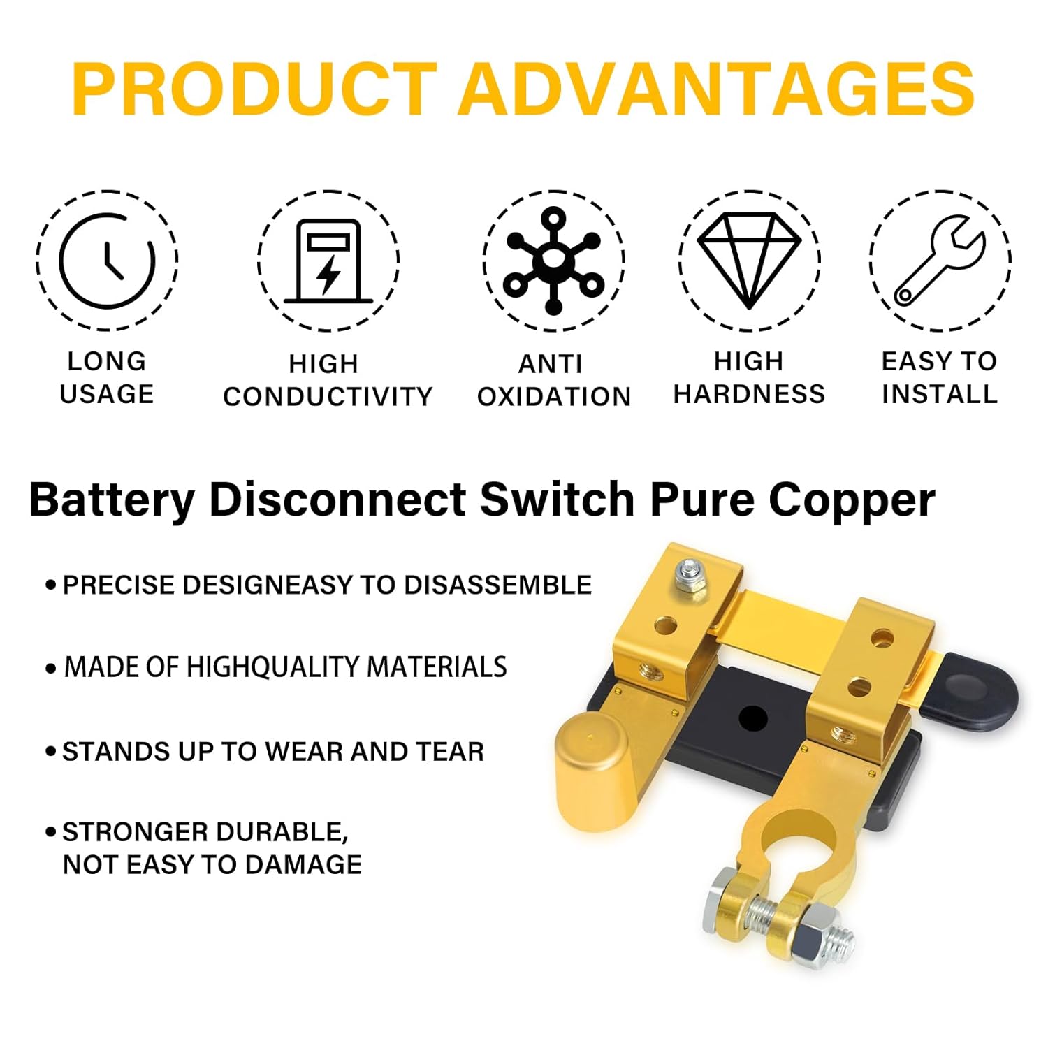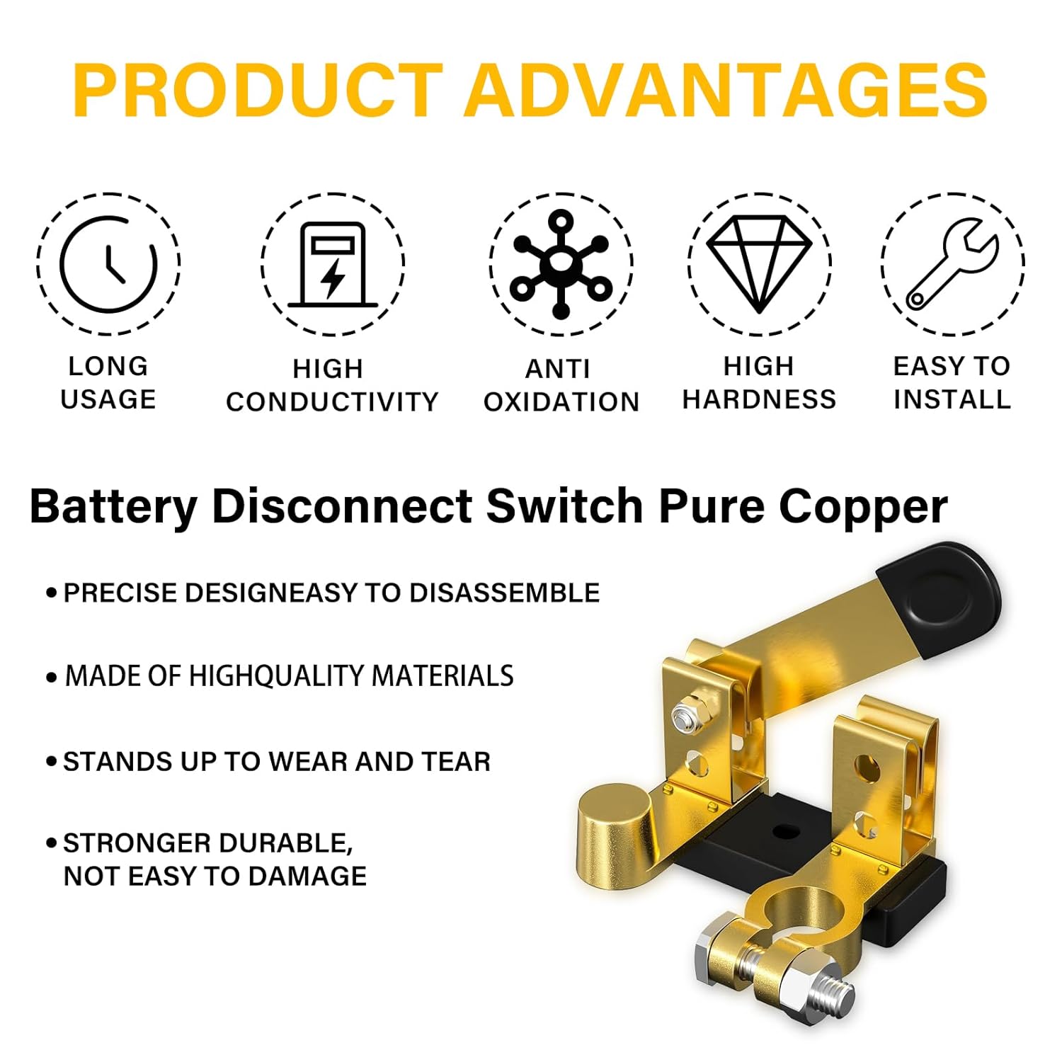 O Interruptor de Desconexão de Bateria é uma solução essencial para quem busca segurança e eficiência no gerenciamento da energia de veículos, embarcações e equipamentos elétricos. Fabricado com cobre sólido de alta qualidade, este interruptor é resistente à ferrugem e à corrosão, garantindo durabilidade e segurança em seu uso. Com um design de lâmina de faca, ele é ideal para terminais de bateria de poste superior, sendo compatível com baterias de 12V e 24V, o que o torna versátil para uma ampla gama de aplicações, incluindo carros, barcos, RVs e ATVs.