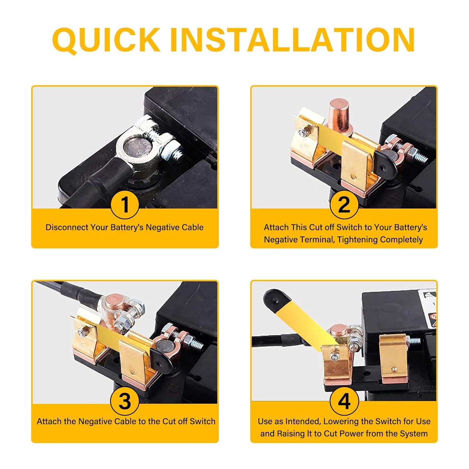 1. Instalação: Conecte o interruptor aos terminais da bateria de acordo com as instruções do fabricante, garantindo que esteja firmemente fixado.