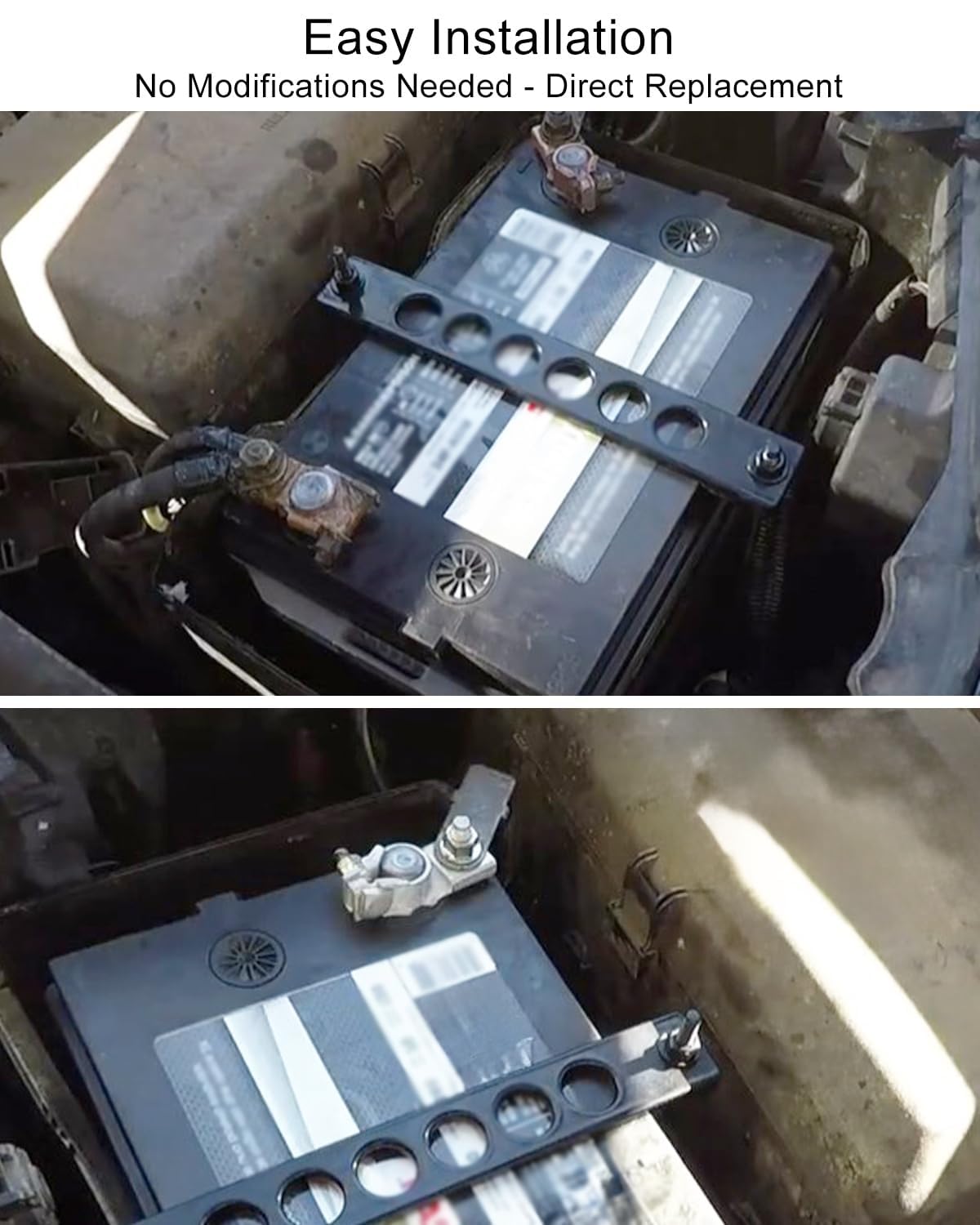 A instalação é simples e não requer modificações. O conjunto é fornecido com uma porca M8, facilitando a conexão segura. O pacote inclui: 1 terminal positivo de bateria 90982-05054 e 1 terminal negativo de bateria 90982-06059.