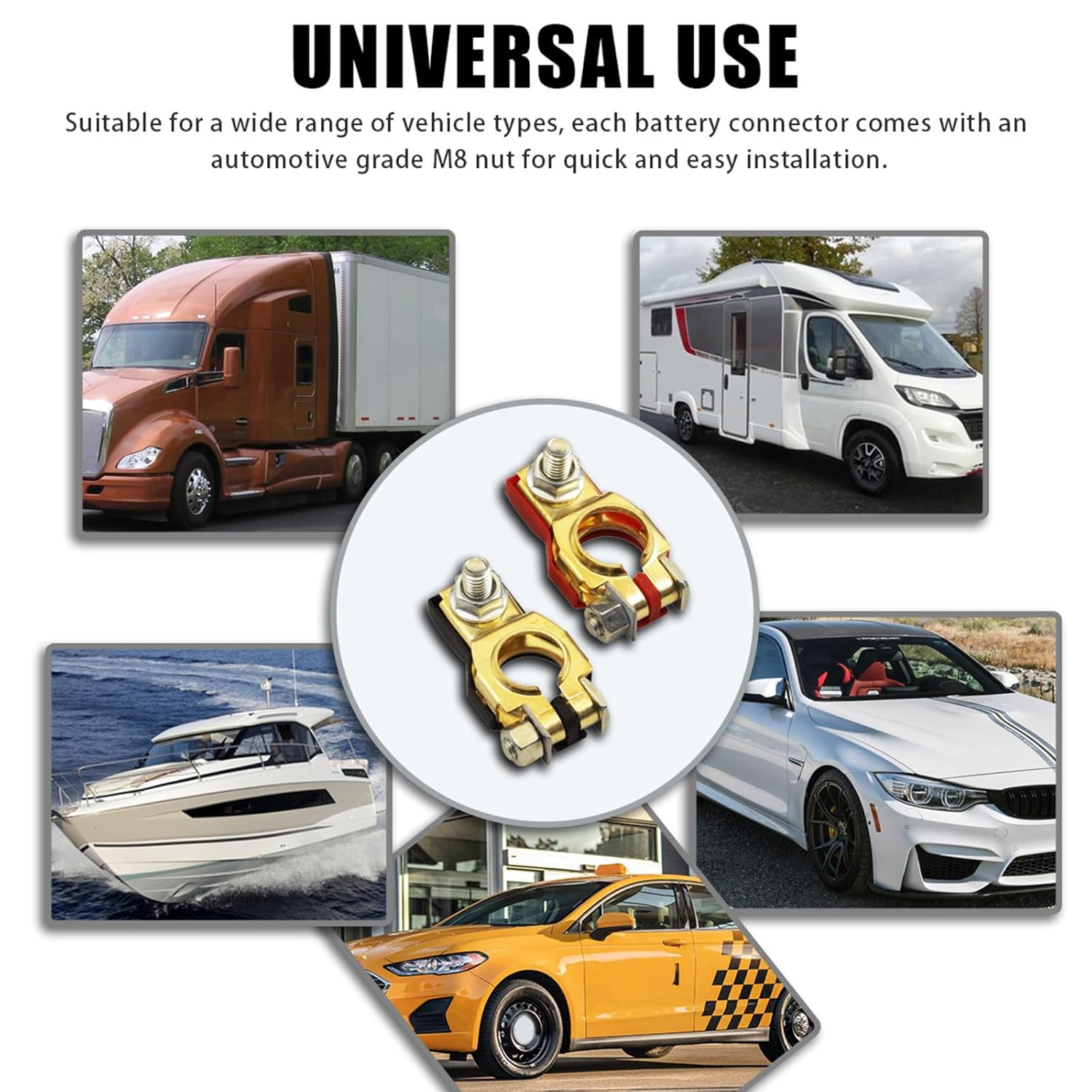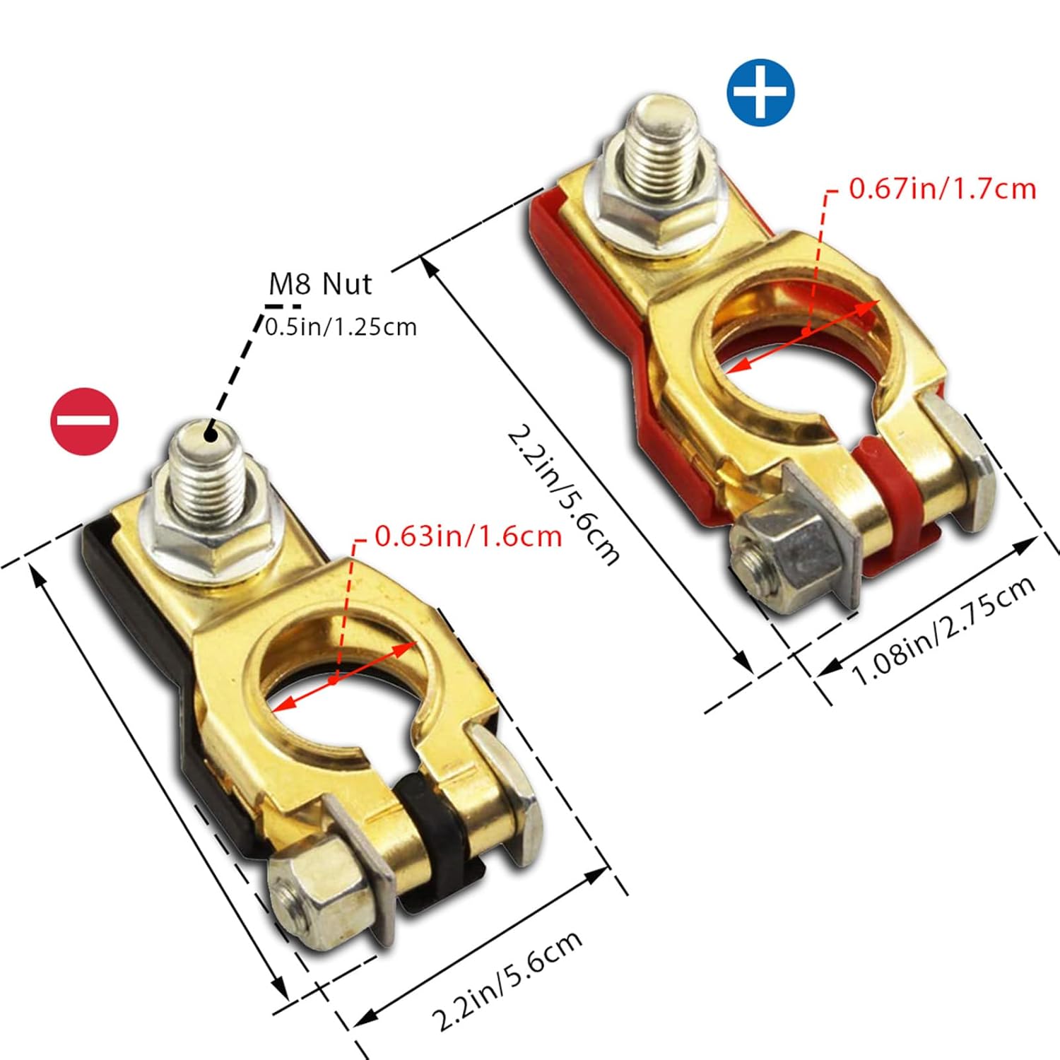 - Fácil de Instalar: Cada conector vem com uma porca M8 e uma arruela correspondentes, permitindo uma instalação rápida e segura. A remoção é simples, facilitando a limpeza e manutenção, sem causar danos ao veículo original. Nota: Certifique-se de conectar os terminais à polaridade correta.