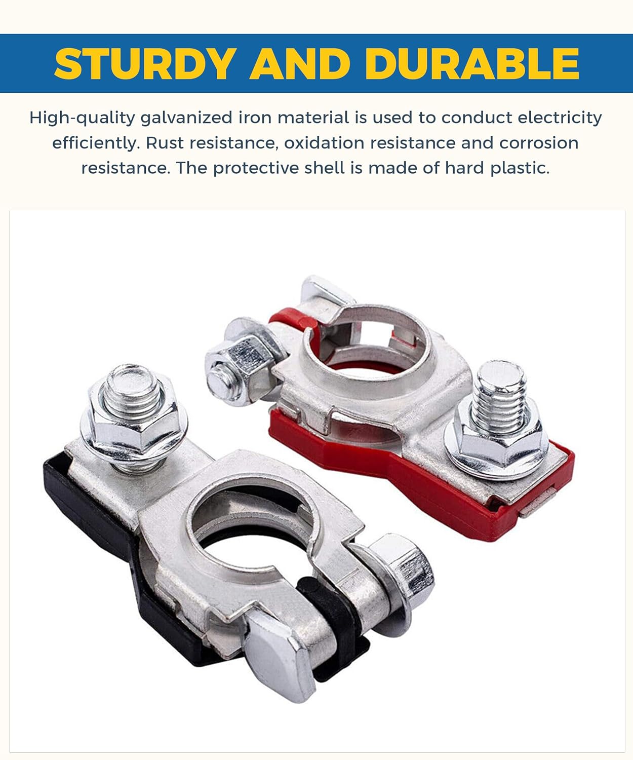 Os conectores de terminais de bateria são componentes essenciais para garantir o funcionamento eficiente e seguro do sistema elétrico do seu veículo. Fabricados com materiais de alta qualidade, esses conectores são feitos de ferro galvanizado, que proporciona excelente condutividade elétrica e notáveis propriedades de resistência à corrosão, oxidação e ferrugem. A proteção adicional da carcaça em plástico duro garante que os conectores sejam à prova d’água e resistentes ao desgaste, permitindo uma longa durabilidade mesmo em condições adversas.