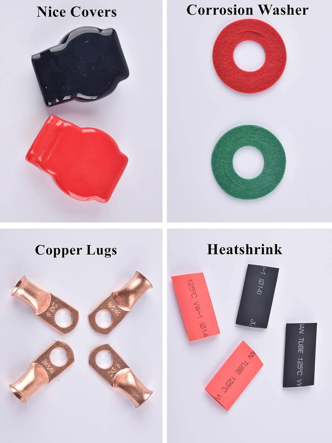 – Lista do Produto: Inclui 2 terminais de bateria pesados, 2 capas de terminais, 2 washers anti-corrosão, 4 tubos termorretráteis e 4 terminais de cobre de 2 gauge 3/8″.