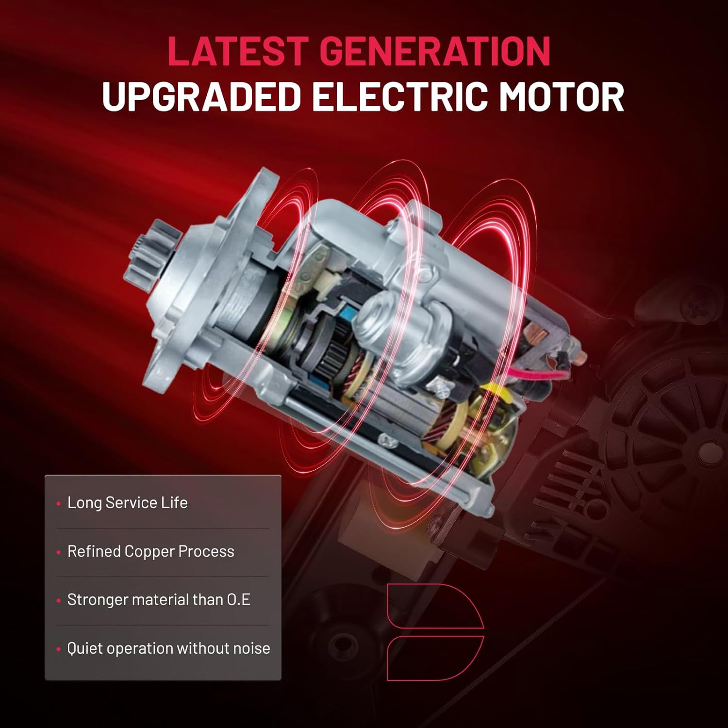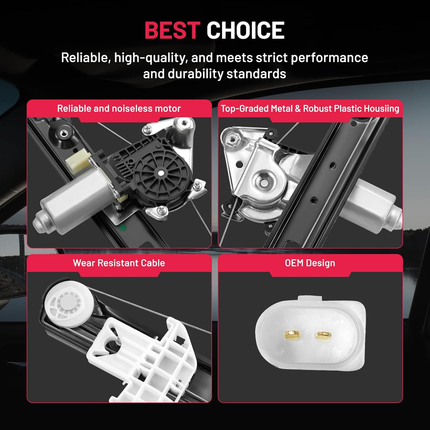 - Qualidade Premium: Este conjunto de regulador de janela e motor apresenta aprimoramentos significativos em relação à peça de fábrica, proporcionando um nível de confiabilidade superior. Incorpora molas de tensão que resistem efetivamente ao enrosco do cabo, causado pelo uso prolongado. Além disso, é equipado com guias de cabo avançadas que eliminam a alta tensão do cabo e reduzem o estresse do mesmo.