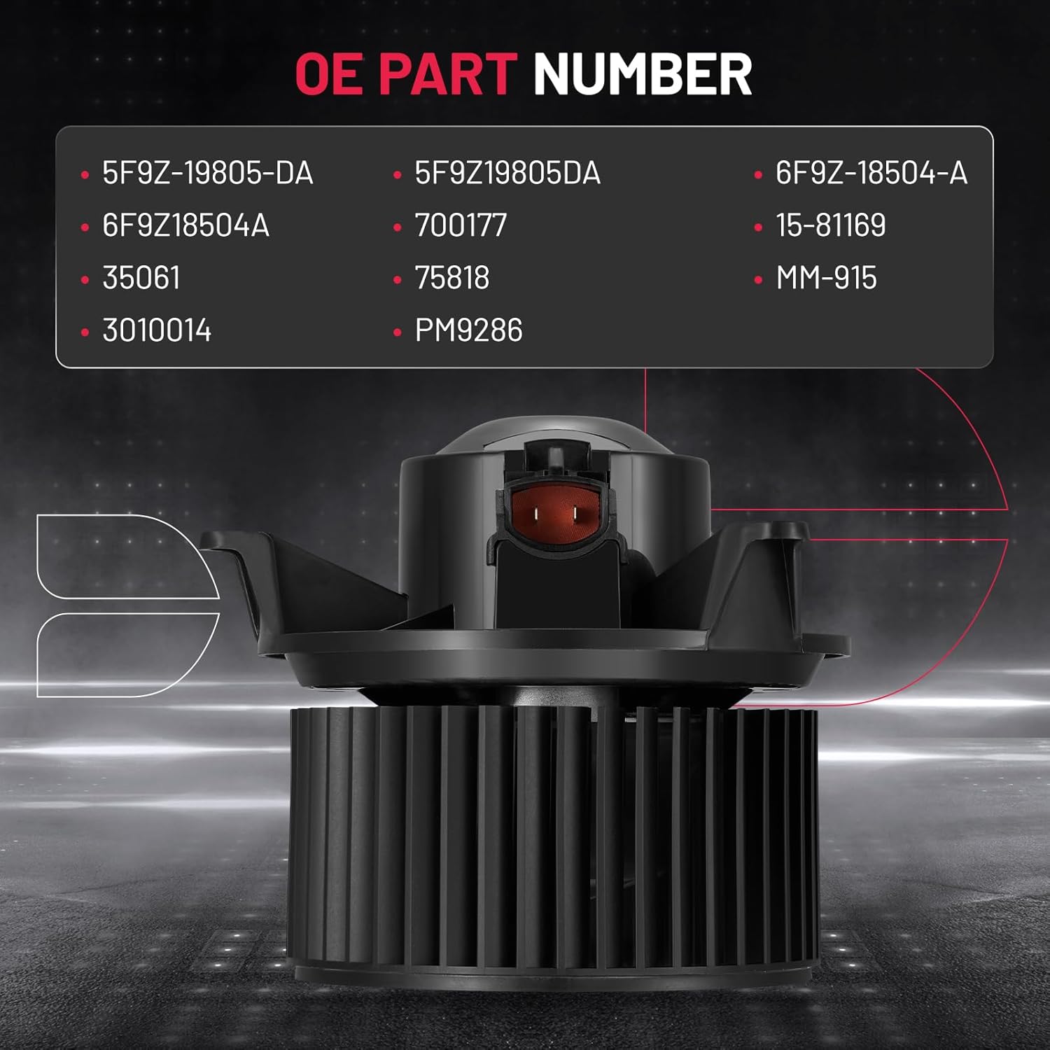 – Números de Peça Compatíveis: Este motor de ventilador é um substituto direto para os números de peça OE: 5F9Z-19805-DA, 5F9Z19805DA, 6F9Z-18504-A, 6F9Z18504A, 700177, 15-81169, 35061, 75818, MM-915, 3010014, PM9286.