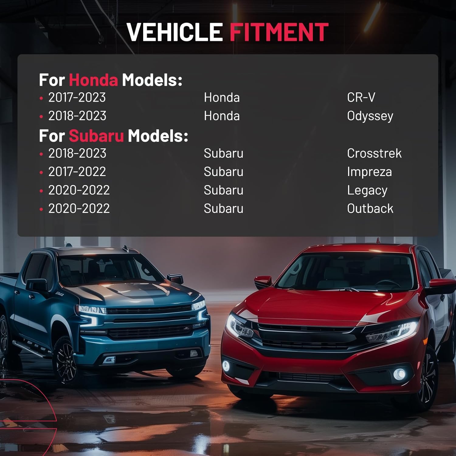 – Compatibilidade: Honda CR-V (2017-2023), Odyssey (2018-2023); Subaru Crosstrek (2018-2023), Impreza (2017-2022), Legacy (2020-2022), Outback (2020-2022).