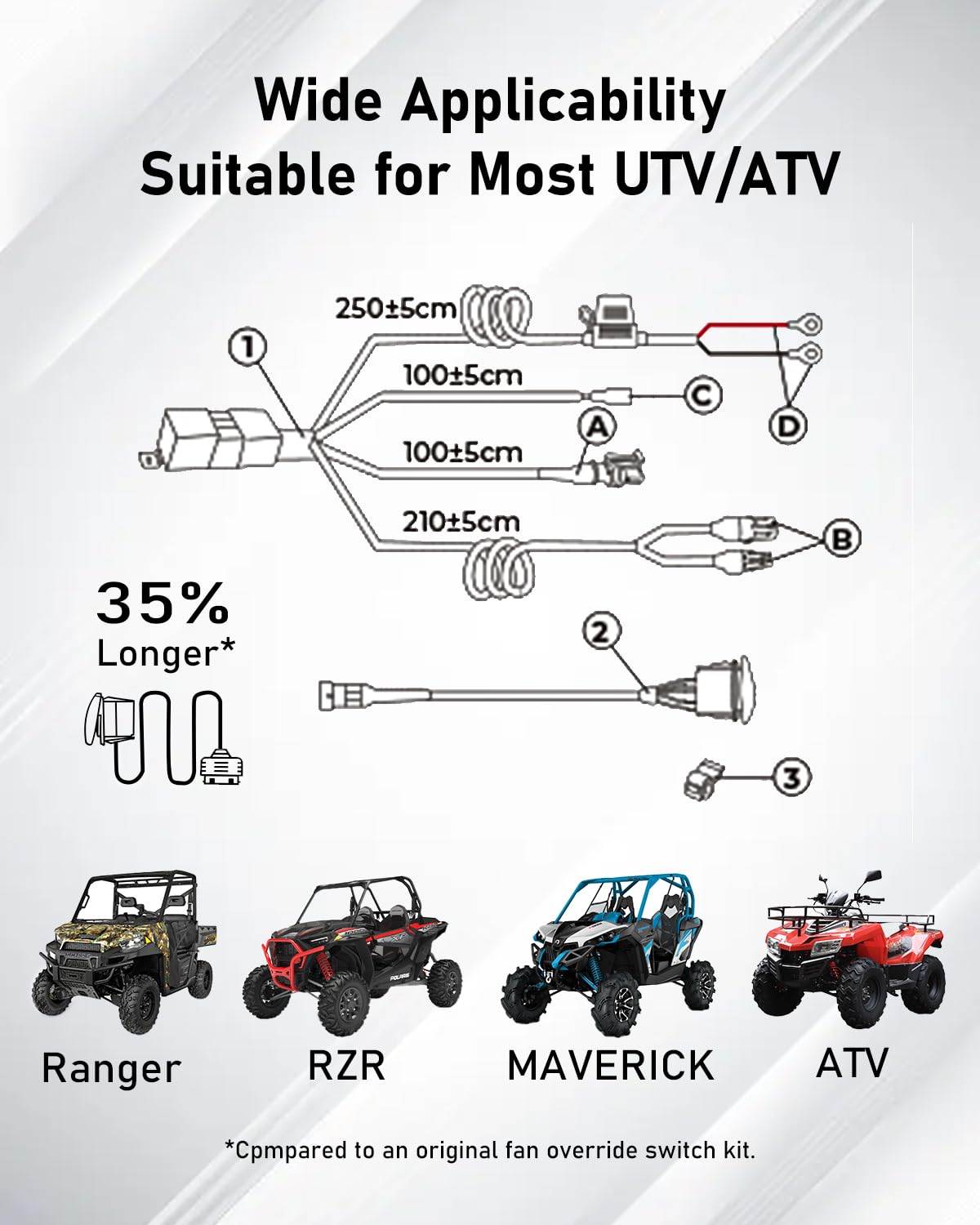– Ampla Adaptabilidade: Com um cabo estendido de 8,2 pés, o kit é compatível com uma variedade de modelos, incluindo Polaris RZR / Ranger 800, 900 XP, 1000 e Can-Am Maverick / Defender / Commander.