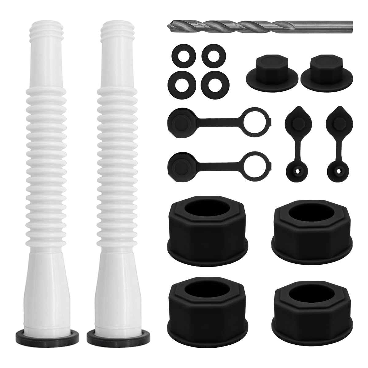 Conteúdo do Pacote: O kit inclui 4 tampas de rosca (2 de rosca grossa e 2 de rosca fina), 2 bicos brancos com juntas de borracha, 2 tampas de bico com rosca, 2 tipos de tampas de ventilação para galões de gasolina e uma broca para instalação. Este conjunto completo é perfeito para substituir bicos antigos e desgastados que estão vazando.