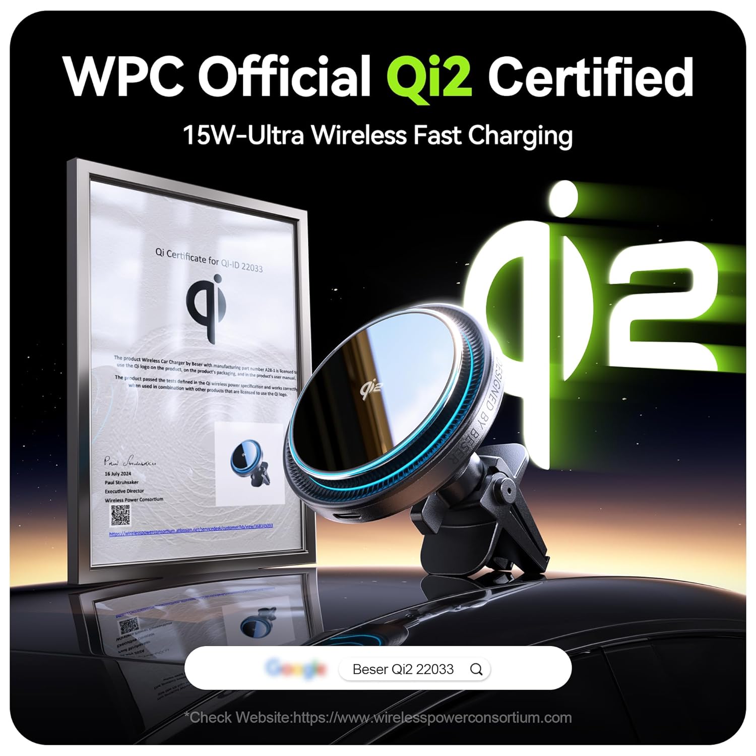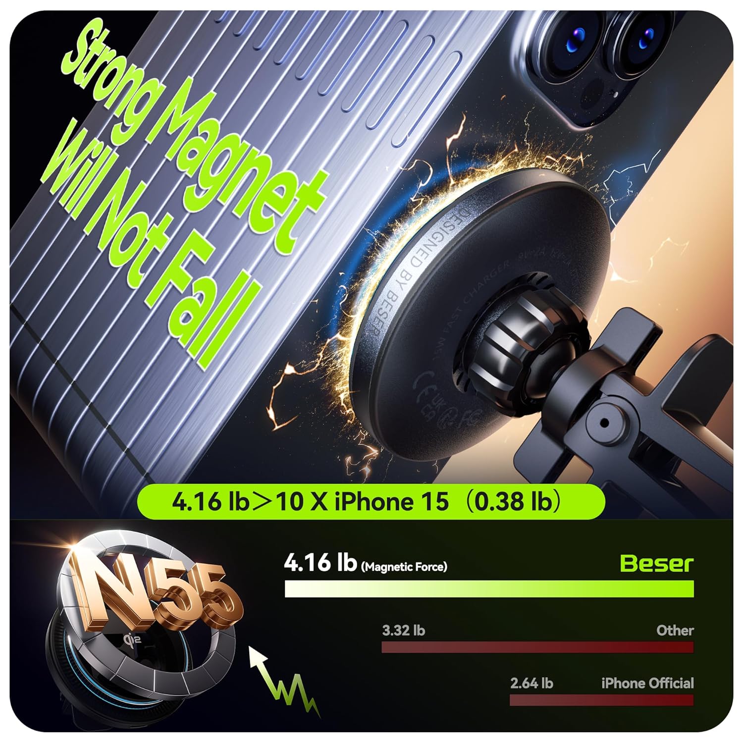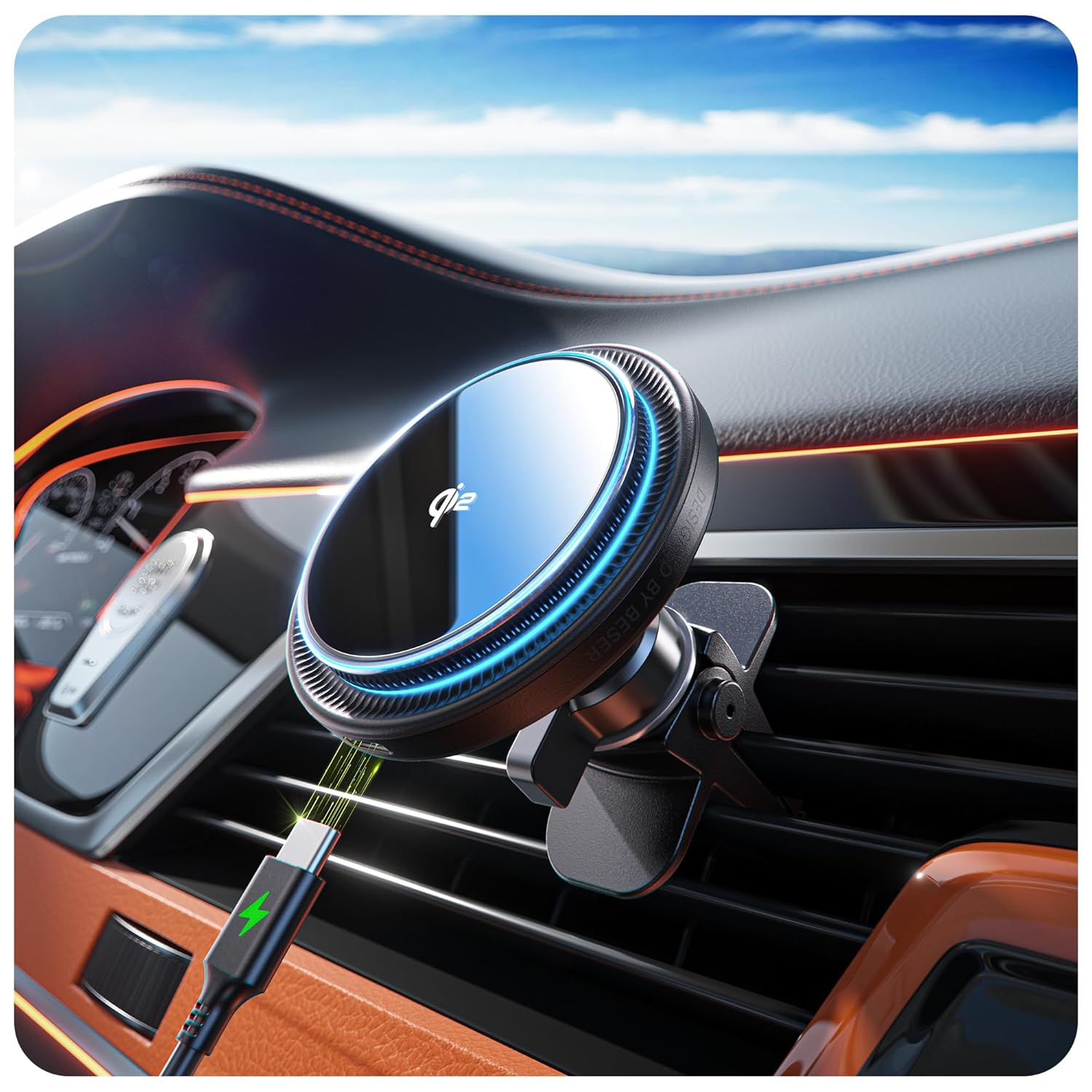Carregador Sem Fio Beser Qi2 15W para Suporte Magnético MagSafe para Carro – Carregamento Rápido para iPhone 16/15/14/13/12 com Ímã Forte (4.16 lbf) para Ventilação/Dashboard