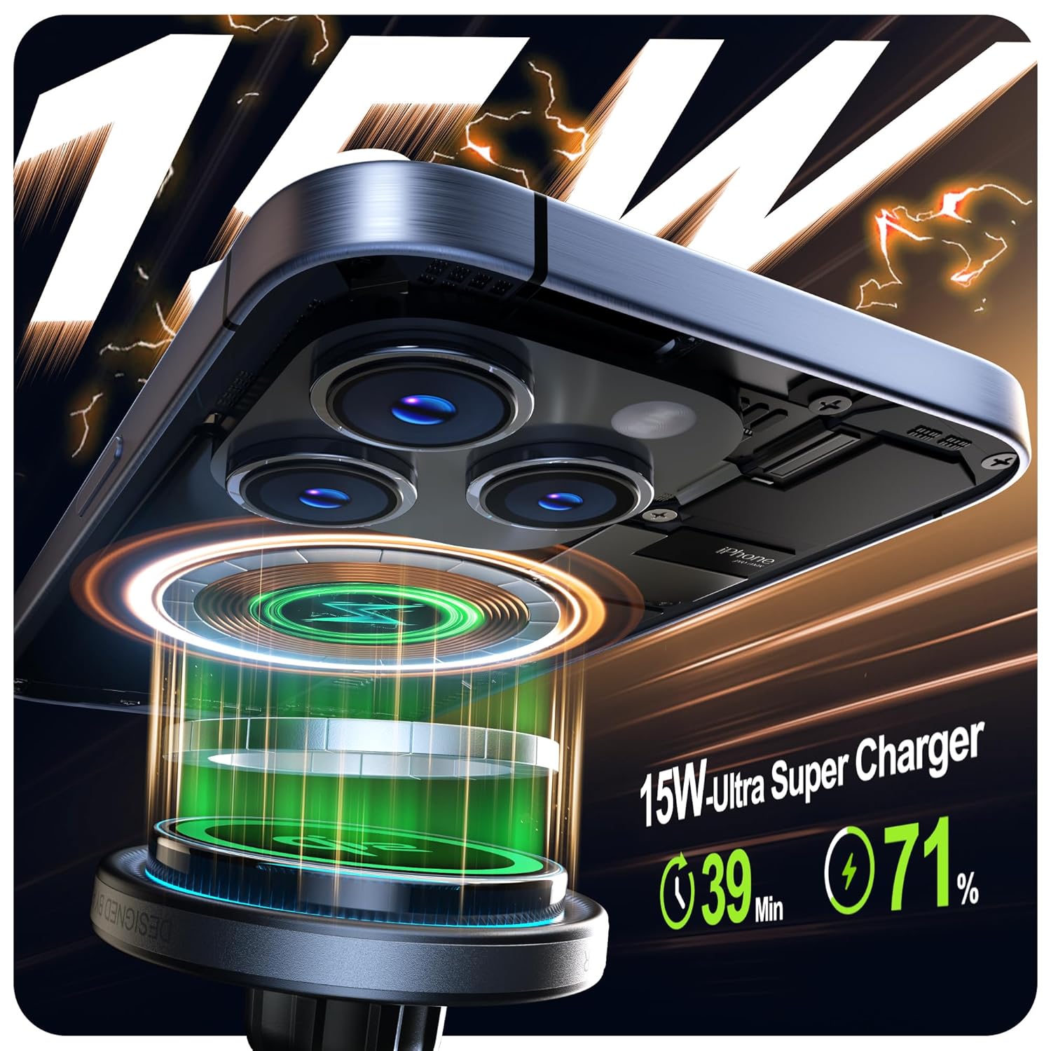 The magnetic hold is incredibly strong keeping my phone securely in place even on bumpy roads. It charges fast and efficiently, delivering a true 15 Watts for my MagSafe-compatible devices.
