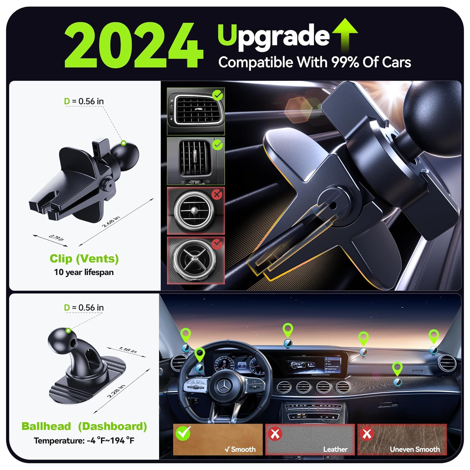 Este carregador se adapta a 99% dos veículos, podendo ser instalado em saídas de ar ou no painel (veja a imagem 6). O clipe ‘eagle claw’ atualizado de 2024 garante 200% mais estabilidade, e inclui um suporte de bola forte (3M) para o painel.