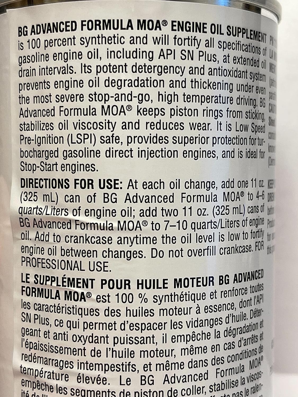 Amazing stuff, put it in my son’s 2018 Chevy Colorado. His vehicle takes 6 quarts, we poured five quarts of oil and stared the engine. We then poured in the MOA, it was amazing, you could hear the engine quiet down and the RPMs lower. Trying it on my 2019 Chevy Custom next week, see if I can get better gas mileage. Going to shoot a video next time.
