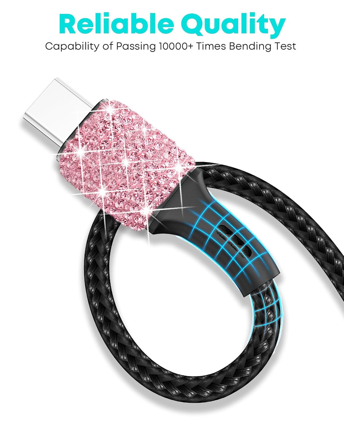 This charger is so blingy & beautiful! It was delivered to my office & when I unpacked it my co-workers sitting with me at our lunch table were distracted & couldn’t take their eyes off of it because it was so sparkly & pretty lol. I’ve had it about a week so I can’t speak to it’s long term durability but it seems well made enough to last as long as any other charger I’ve owned. I was concerned that perhaps the larger charger ends wouldn’t fit with my phone case but while it’s a slightly tight fit it works just fine. Be aware that this is the three charger ports (lightening, C & micro USB) that divide off of ONE cord (see photo). I knew that when I ordered it but if you’re expecting three separate charger cords you might be disappointed. Personally I’m thrilled with this charger though!!