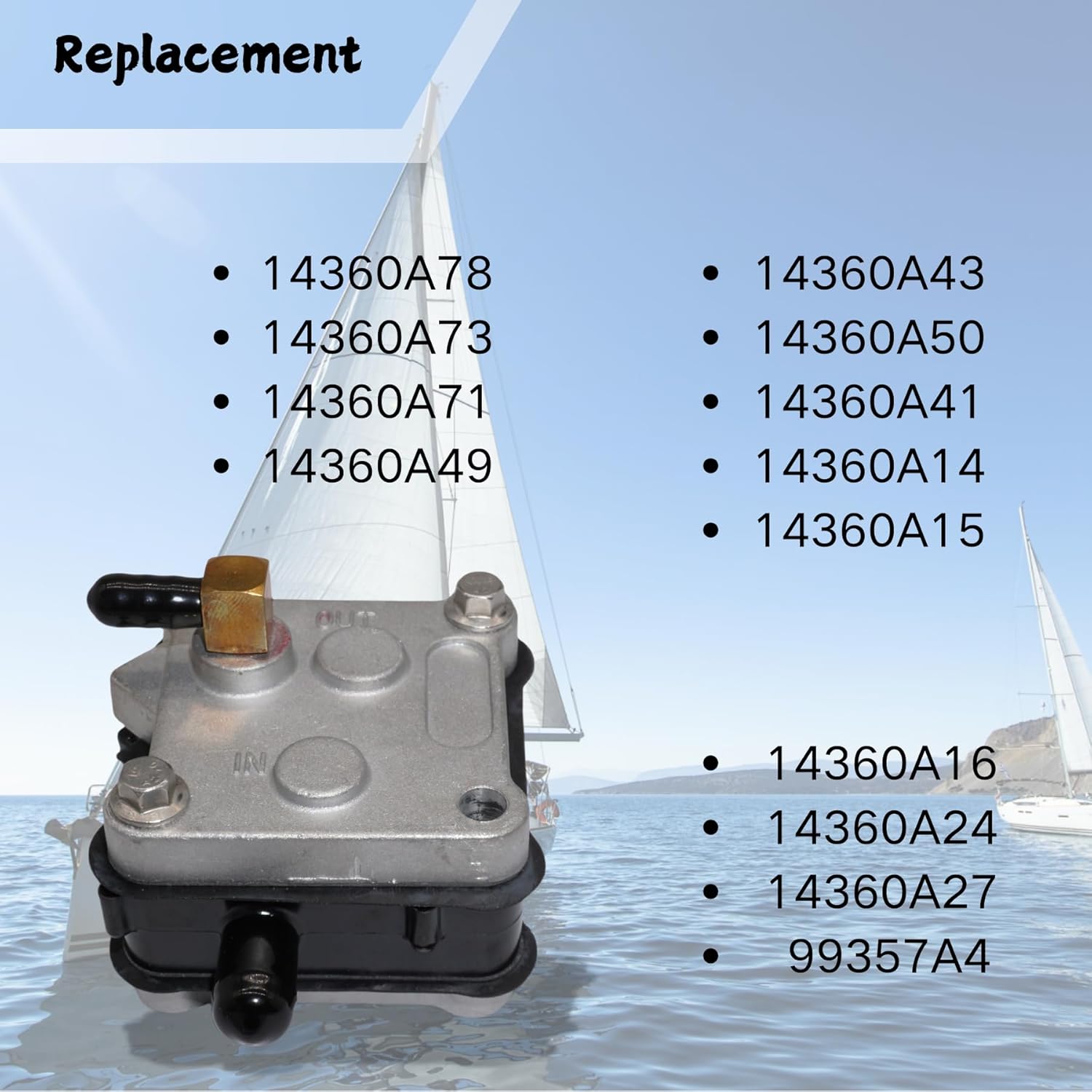O Kit de Bomba de Combustível Boat Marine 14360A78 é a escolha perfeita para proprietários de embarcações que desejam garantir o máximo desempenho de seus motores Mercury de 2 tempos, com potências que variam de 30 a 300 HP. Este kit é um substituto direto para os modelos de bomba de combustível originais, como o 14360A73, e é projetado para oferecer uma performance superior, assegurando que sua embarcação opere de forma eficiente e sem interrupções.