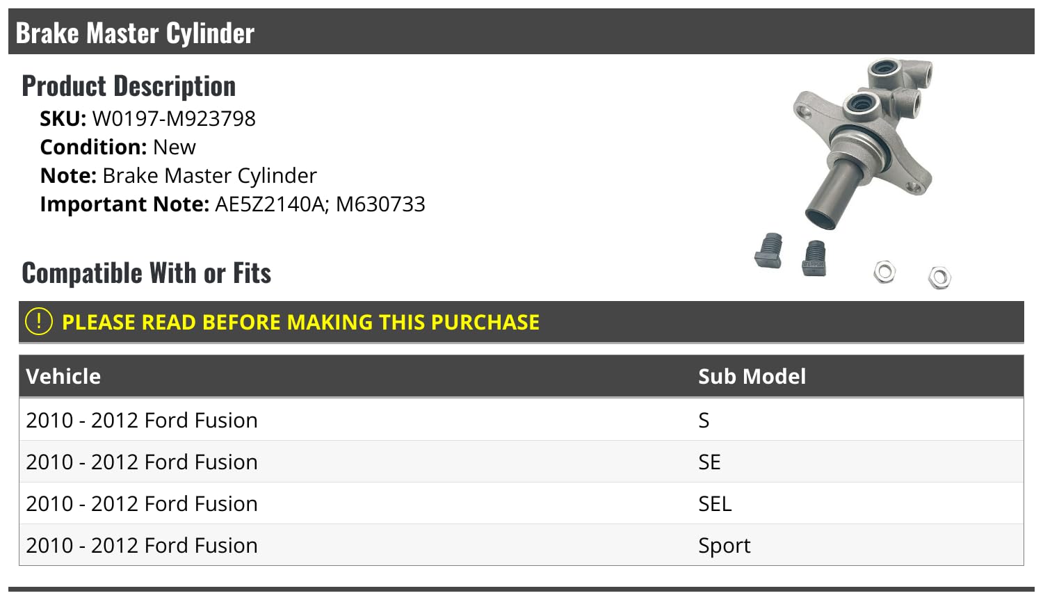 Resposta: Este cilindro mestre é especificamente compatível apenas com os modelos Ford Fusion S, SE, SEL e Sport de 2010 a 2012.