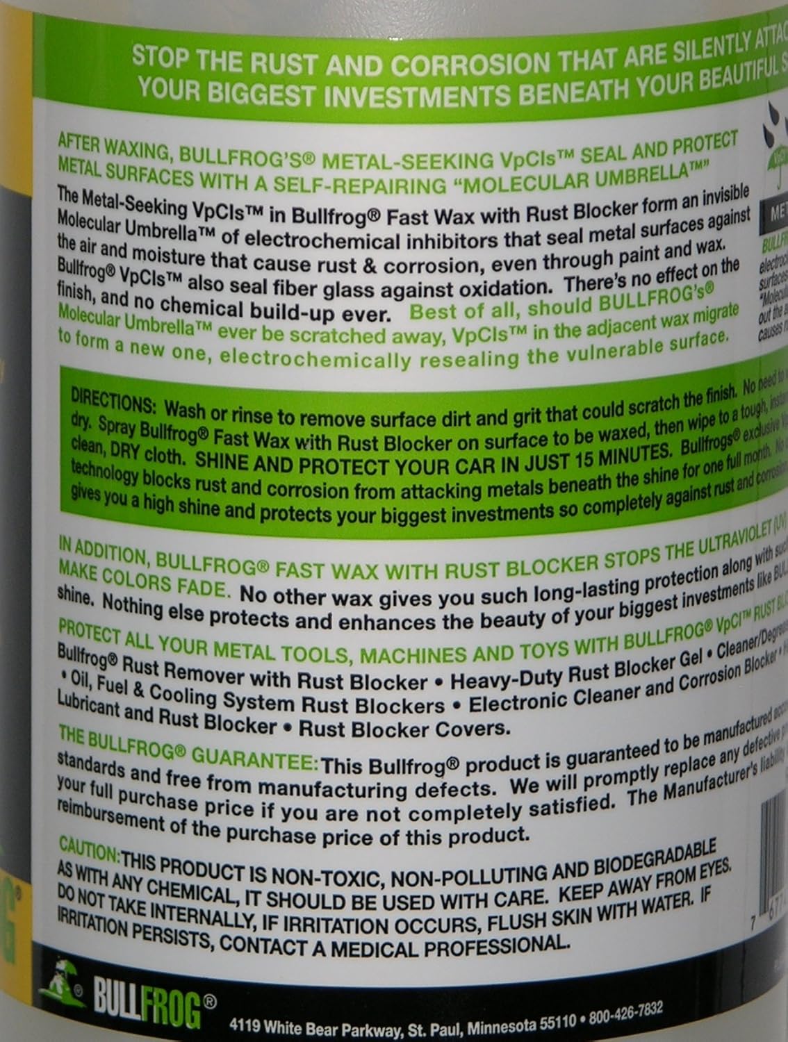 Descrição do Produto: Bullfrog Fast Wax Spray com Tecnologia VCI de Bloqueio de Ferrugem