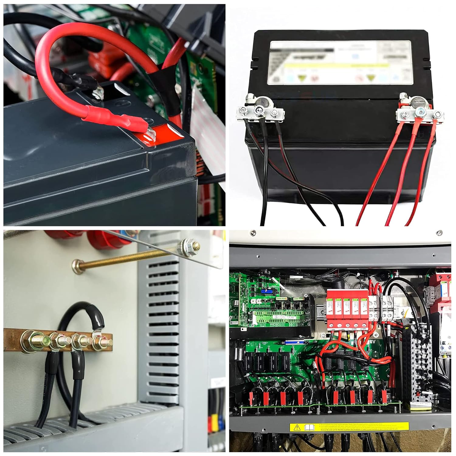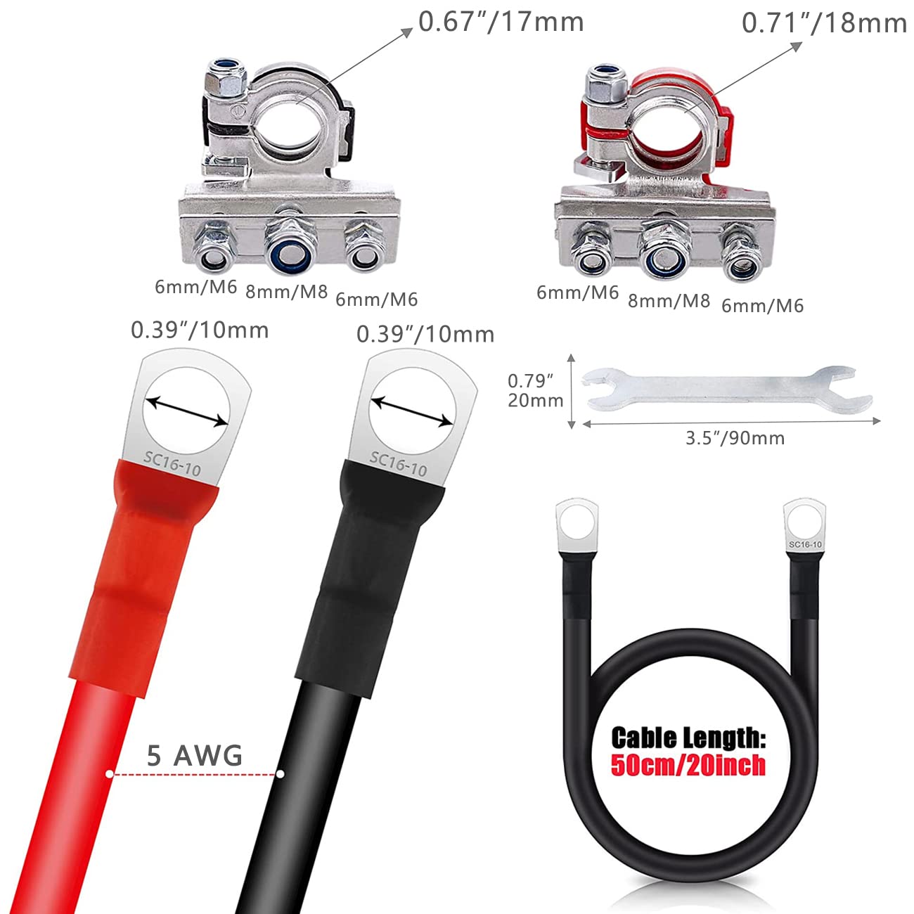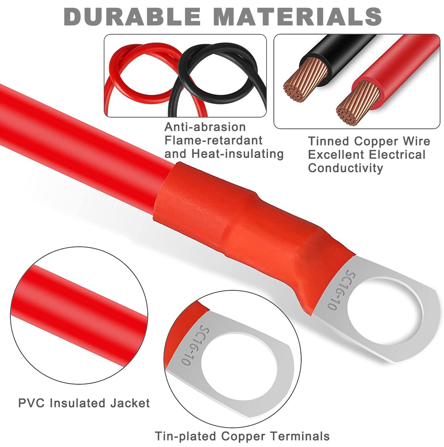 O conjunto de cabos de bateria inclui fios de 5 AWG, com 20 polegadas de comprimento, que são ideais para conexões seguras e confiáveis. Cada cabo é equipado com conectores redondos de 3/8″ (M10) em ambas as extremidades, facilitando a instalação em terminais de bateria padrão. Os conectores são codificados por cores, com vermelho para o positivo e preto para o negativo, tornando a identificação e a conexão ainda mais simples e seguras.