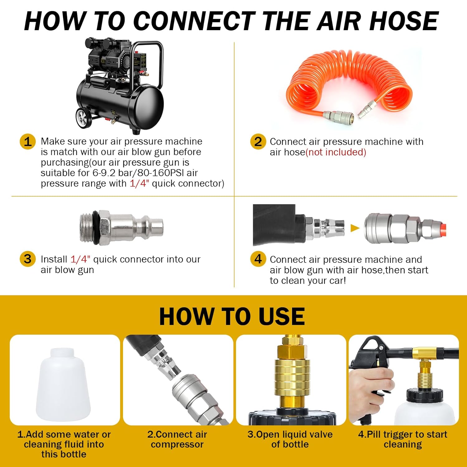 Compatível com a maioria dos compressores de ar padrão, a pistola de limpeza é fácil de usar em qualquer ambiente. Basta conectá-la ao seu compressor e você estará pronto para enfrentar as tarefas de limpeza mais desafiadoras, seja em casa, na garagem ou em movimento.