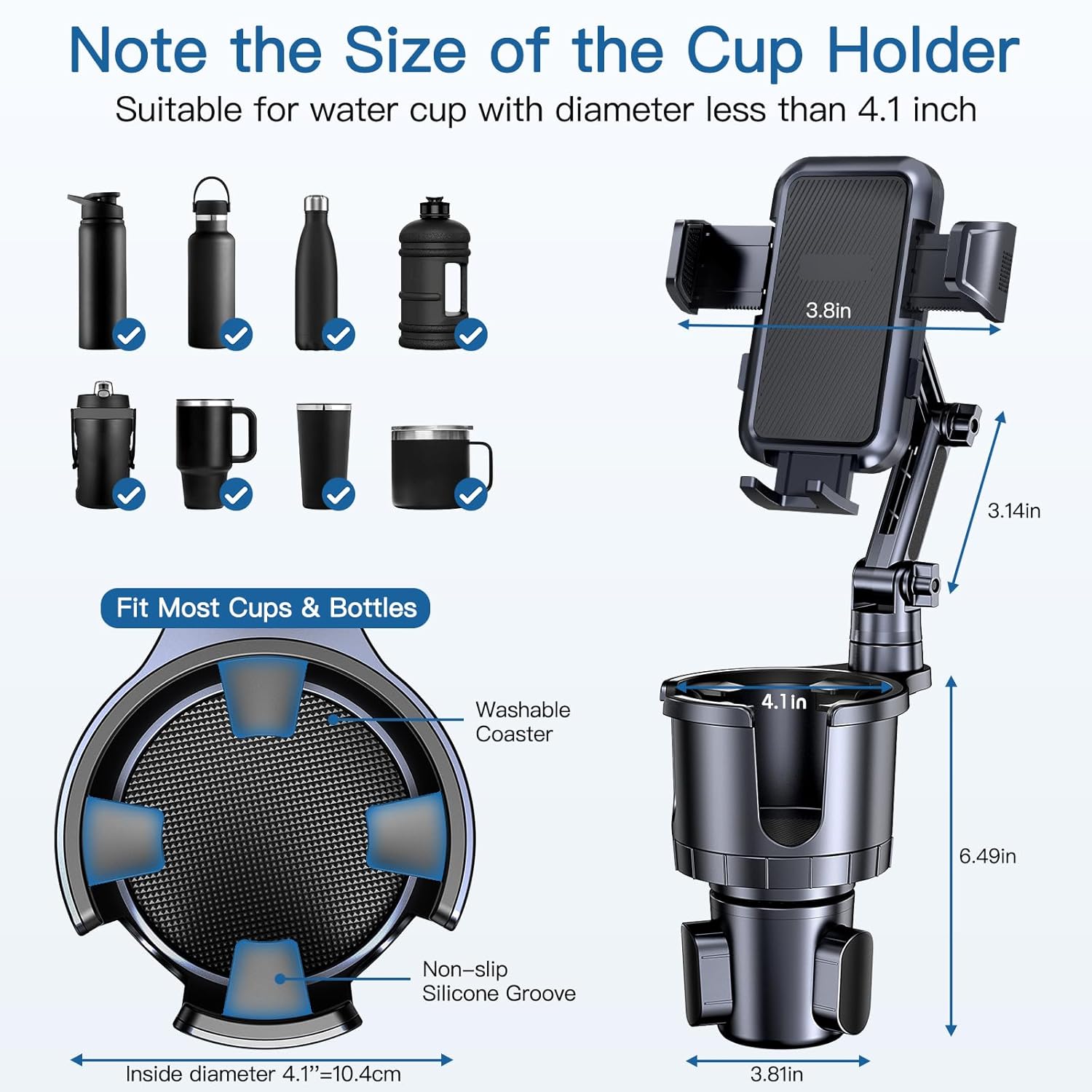– 2 em 1 e Base Ajustável: O suporte para celular pode ser utilizado simultaneamente como suporte para copo. A base expansível se ajusta de 2,68″ a 3,82″ (68mm-97mm), permitindo que se encaixe na maioria dos porta-copos de carros. O pacote inclui três extensores de base destacáveis, compatíveis com garrafas de 12 a 40 oz e diâmetro de até 4,1″ (10,4 cm).