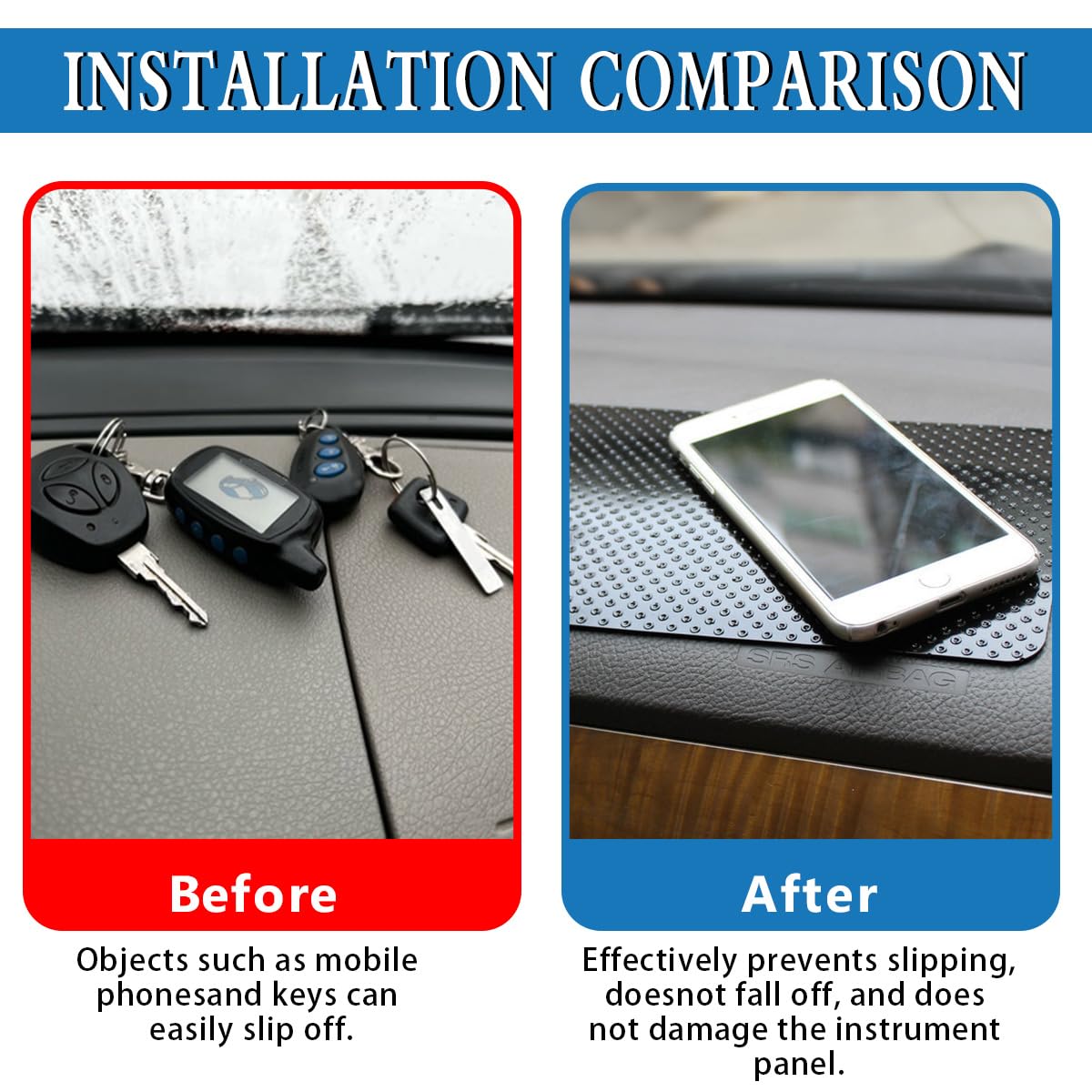 O Car Dashboard Anti-Slip Mat se destaca pela sua capacidade de aderência. Com um efeito antiderrapante excepcional, ele mantém seus itens firmemente no lugar, permitindo que você coloque seu celular, perfumes, cigarros, canetas, moedas e óculos sem se preocupar com quedas, mesmo em estradas esburacadas ou durante frenagens bruscas.