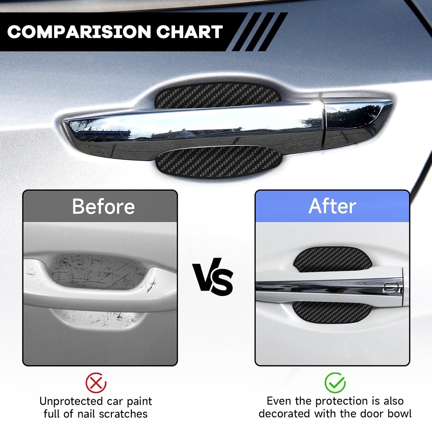 Proteção Confiável: Fabricado com material de fibra de carbono de alta qualidade e adesivo forte, este protetor é macio e elástico, resistente a quebras e desbotamento. Ele se destaca em condições climáticas extremas, sendo à prova d’água e eficaz em todas as estações, seja em dias quentes, frios ou durante a lavagem do carro.