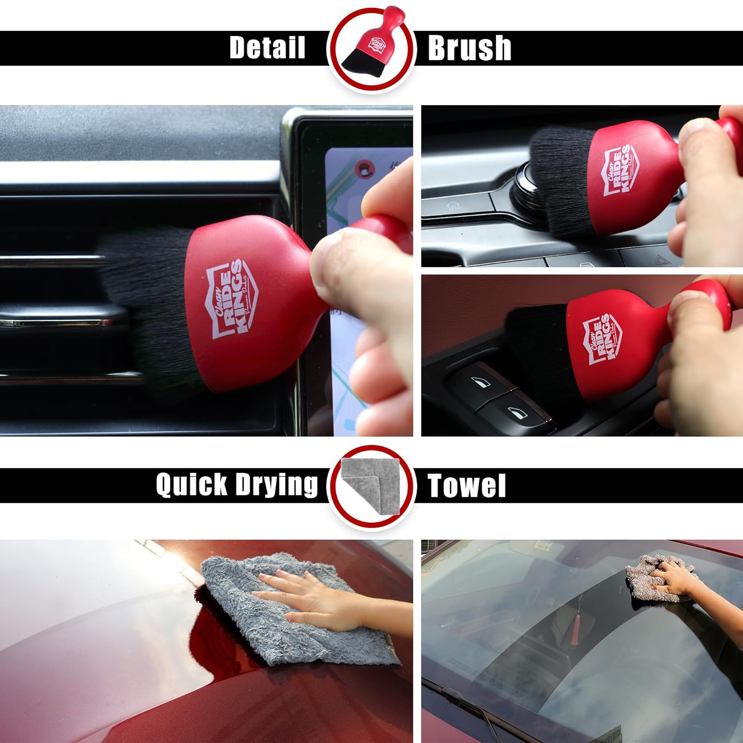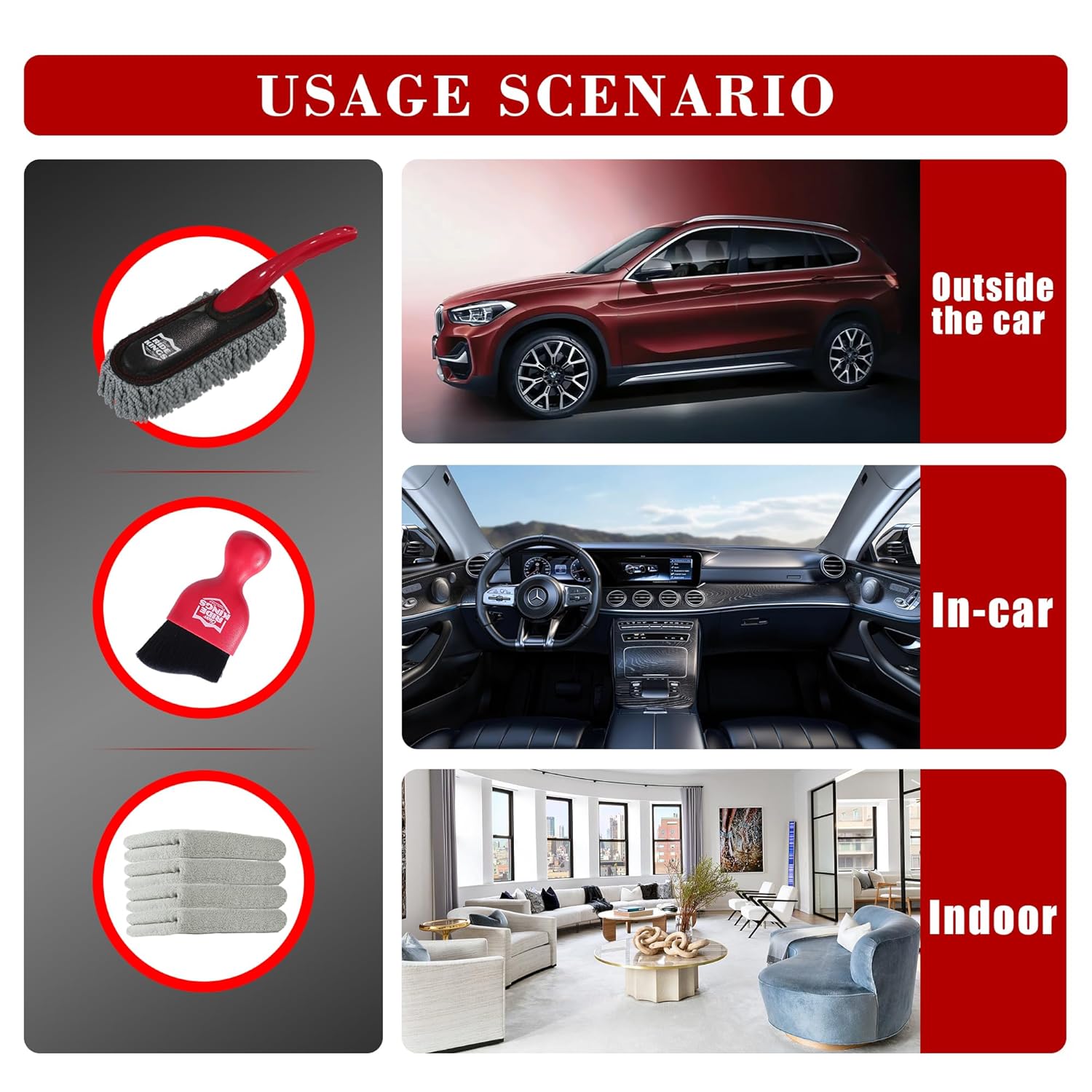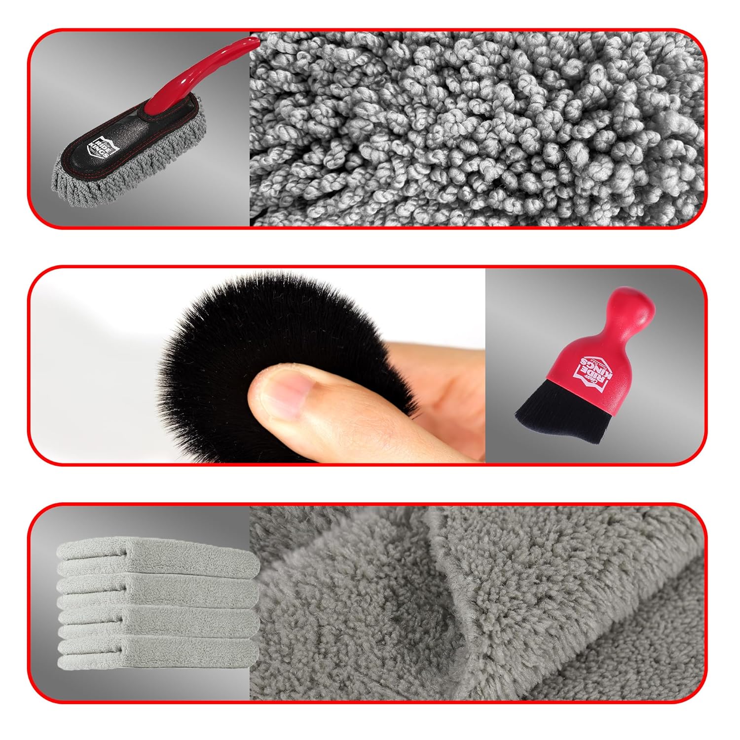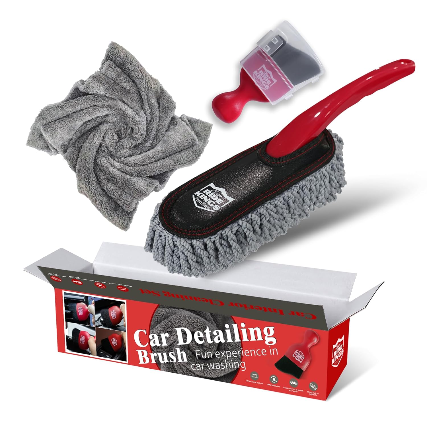 – Conjunto de 3 Peças: Inclui uma mini escova duster, uma escova de detalhamento e uma toalha de microfibra.