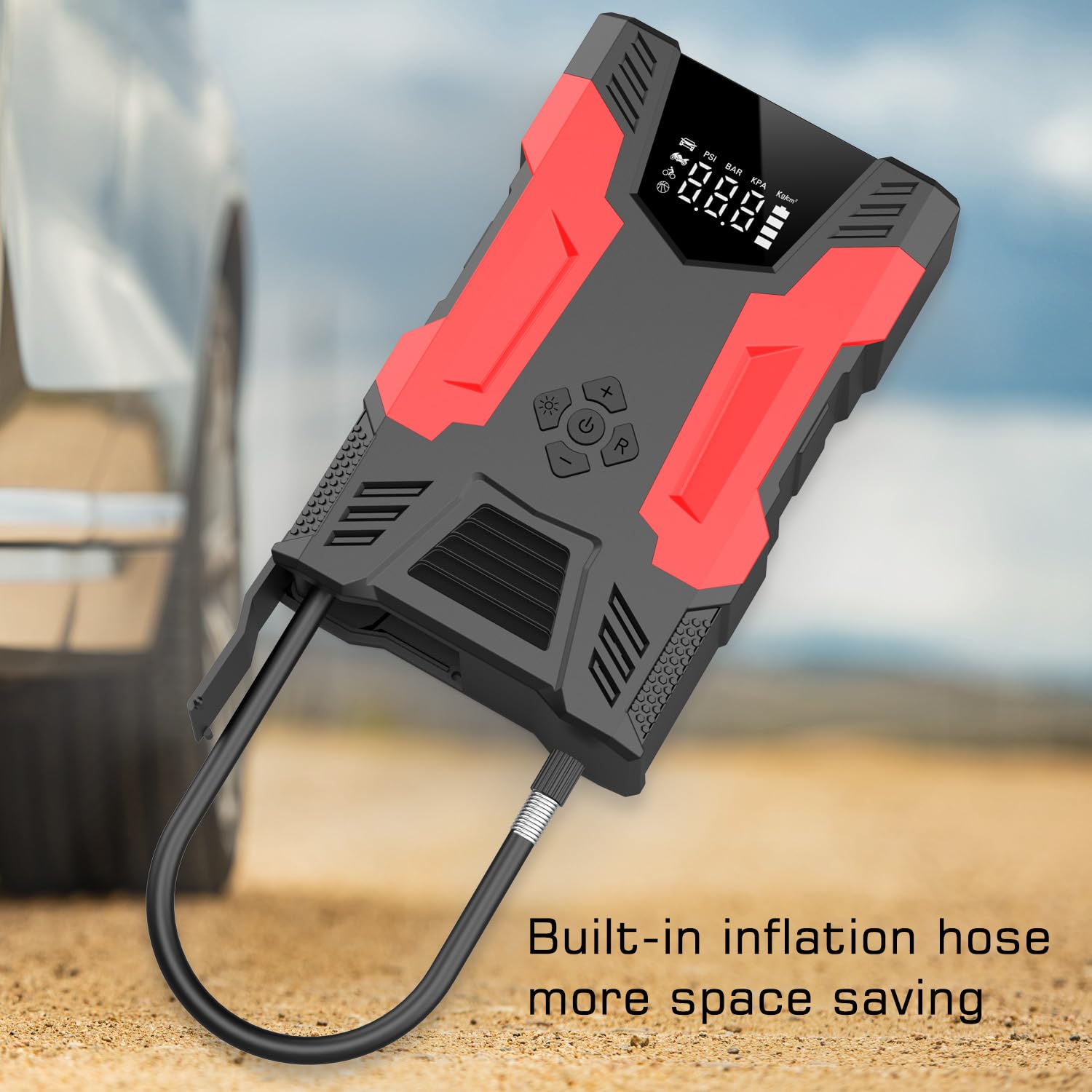 Além de sua função de partida, o dispositivo conta com um inflador de pneus potente com pressão máxima de 150 PSI. Diferente dos jump starters tradicionais, o compressor de ar é integrado ao aparelho, economizando espaço e facilitando o transporte. O inflador para automaticamente ao atingir a pressão pré-definida, e um display digital exibe a pressão em tempo real. O acessório inclui três tipos de agulhas infláveis, permitindo inflar não apenas pneus, mas também bicicletas, colchões infláveis e bolas.