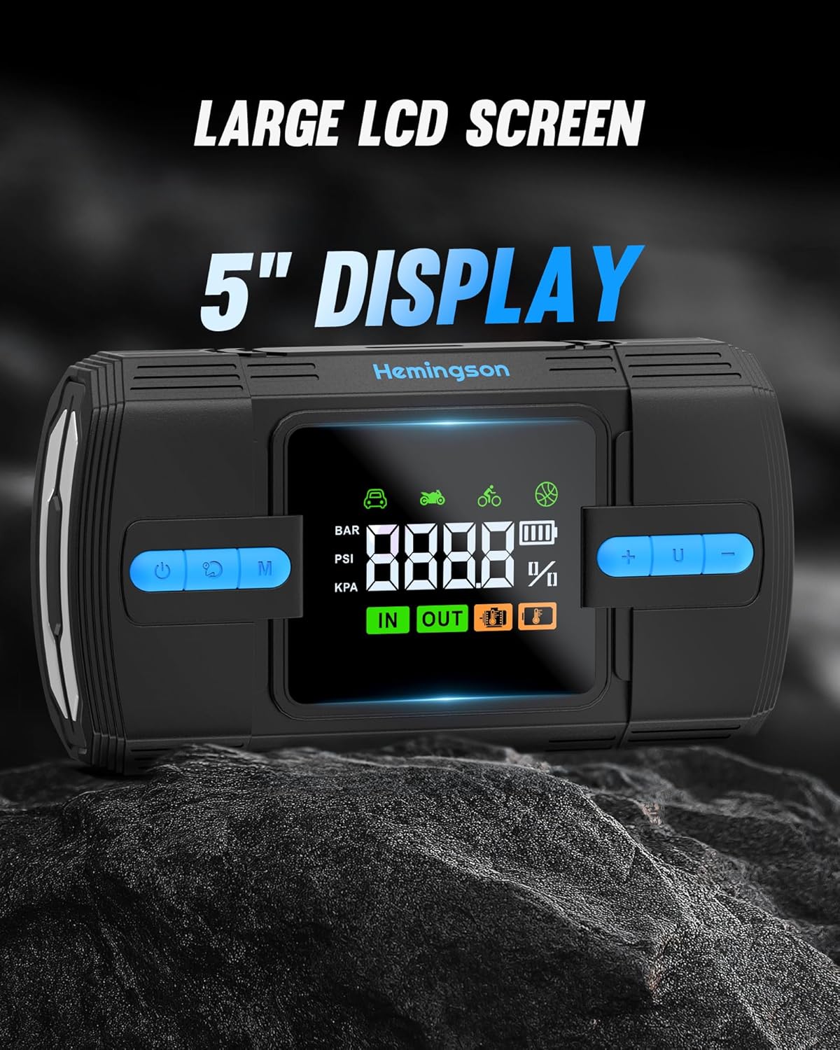 Além de sua função principal, o jump starter conta com um compressor de ar digital inteligente com uma pressão máxima de 160 PSI, capaz de inflar pneus de carro a 20 PSI em apenas 2 minutos. Equipado com uma tela LCD de 5 polegadas, ele permite a detecção da pressão dos pneus, pré-configurações inteligentes e funções de desligamento automático. Você pode alternar facilmente entre três unidades (BAR, KPA, PSI) e utilizá-lo para diversas necessidades de inflação, incluindo carros, bicicletas, bolas esportivas e boias de natação. Seu design compacto e a função de desligamento automático garantem conveniência e eficiência em todas as suas tarefas de inflação.