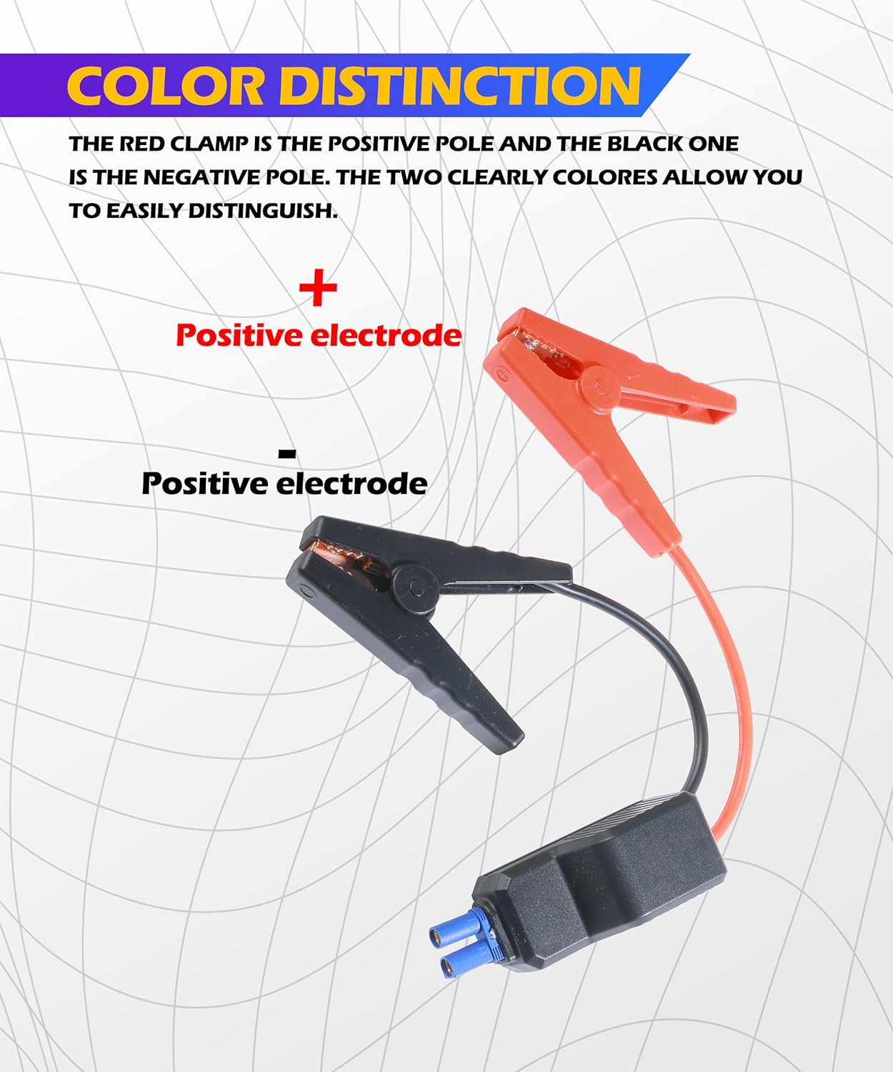 A instalação é simples e intuitiva. O extremo azul é o conector de energia OD EC5, o clip vermelho é o terminal positivo e o clip preto é o terminal negativo. Com essa configuração clara, você pode conectar o cabo à fonte de partida correta rapidamente, tornando o processo de arranque ainda mais eficiente.