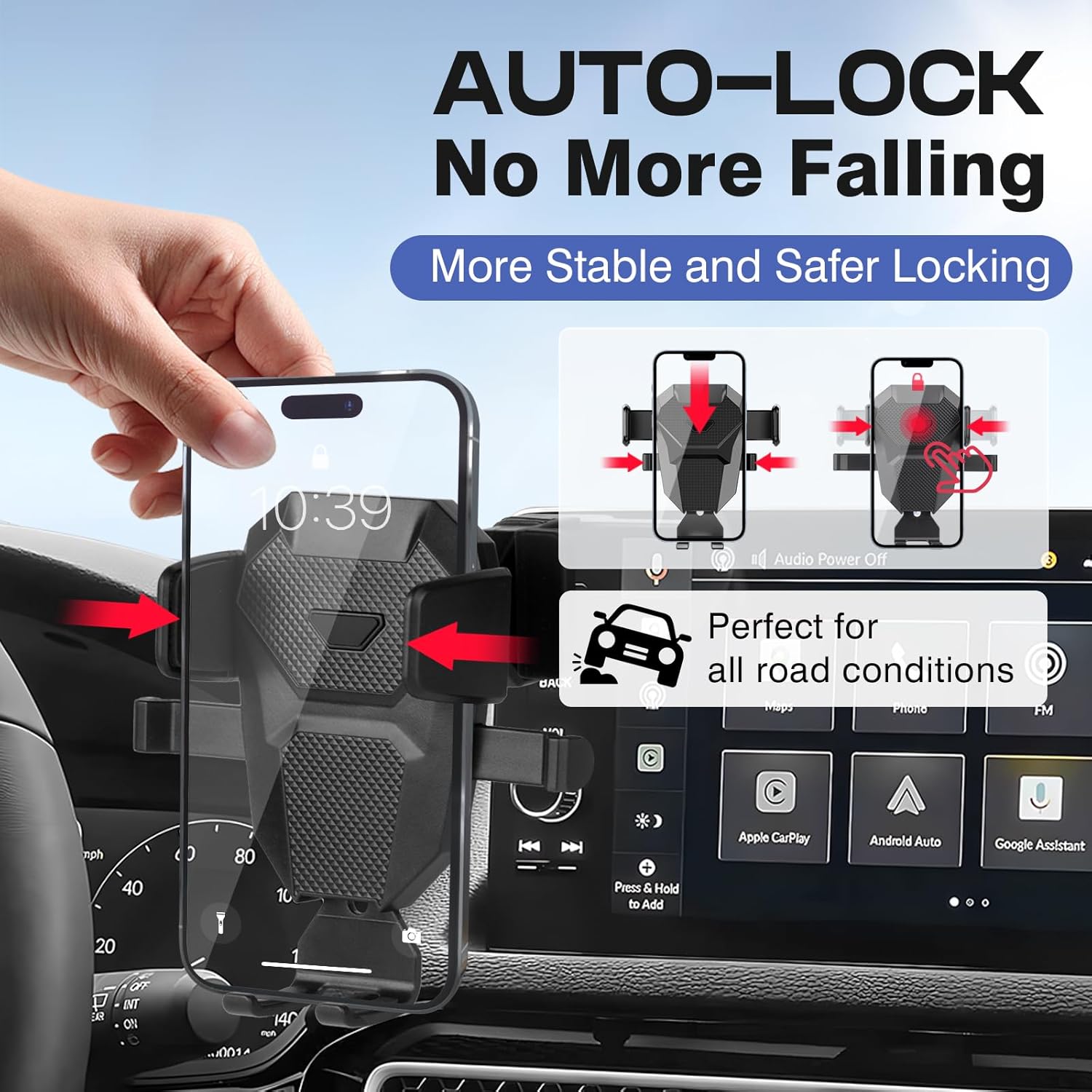 – Agarre Seguro para o Celular: Com uma estrutura triangular estável e mandíbulas micro ratchet, o suporte mantém seu celular firmemente preso, prevenindo quedas e arranhões, mesmo em estradas irregulares. Dirija com segurança e confiança!