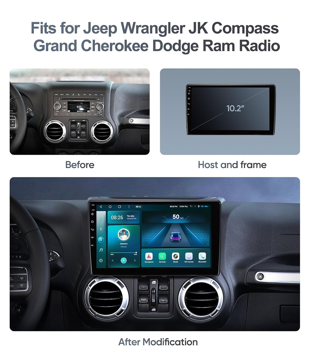 The **Car Stereo Radio Replacement** for Jeep Wrangler, Compass, Grand Cherokee, and Dodge Ram with its 10-inch touch screen offers a significant upgrade for enhancing your vehicle’s entertainment and functionality.