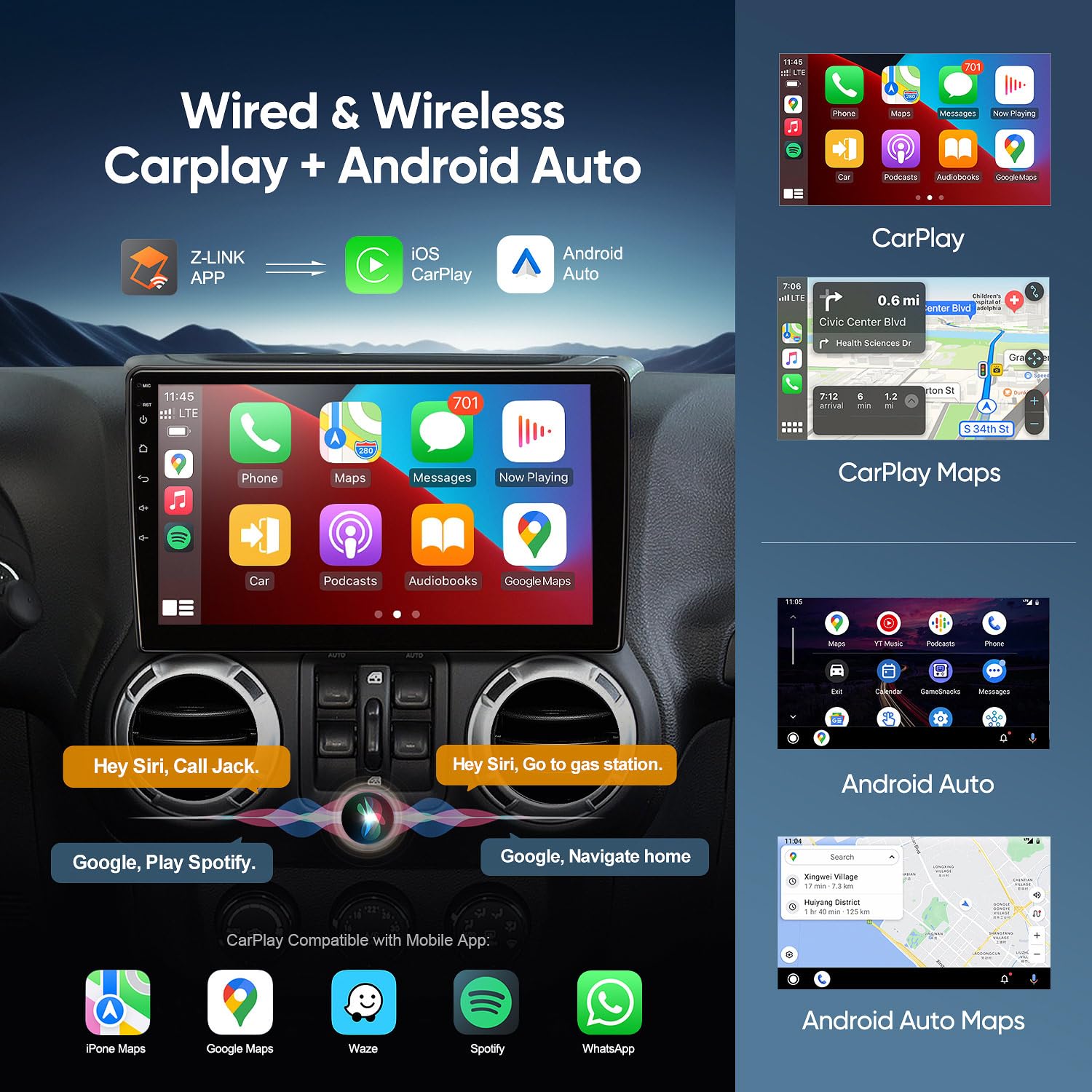 – **Wireless/Wired CarPlay & Android Auto**: The stereo supports both wireless and wired connections for Apple CarPlay and Android Auto. This allows access to essential phone functions such as navigation, messages, and music while driving, with voice control through Siri or Google Assistant for added safety.
