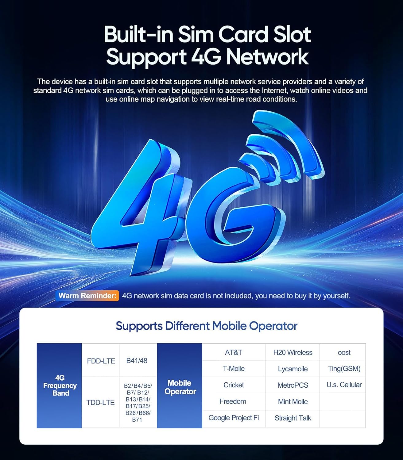 – **Built-in SIM Card Slot & 4G Connectivity**: Featuring a 4G SIM card slot and antenna, this unit allows you to stay connected on the go. With a mobile data plan, you can stream music, watch videos, or browse the internet without relying on Wi-Fi.
