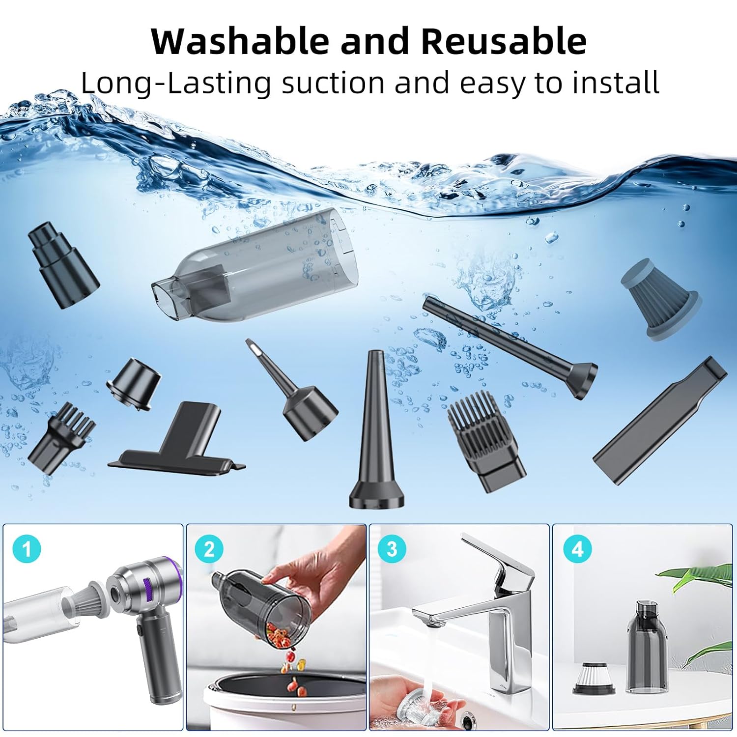 Absolutely love this product. Great battery life, powerful, and multi-purpose. This is lightweight and well balanced. I love that it came with so many attachments and extra filters. I use a soft child toothbrush to clean off the filter…works great. Highly recommend this for a craft room, car, at the office, anywhere you need a powerful little vacuum!