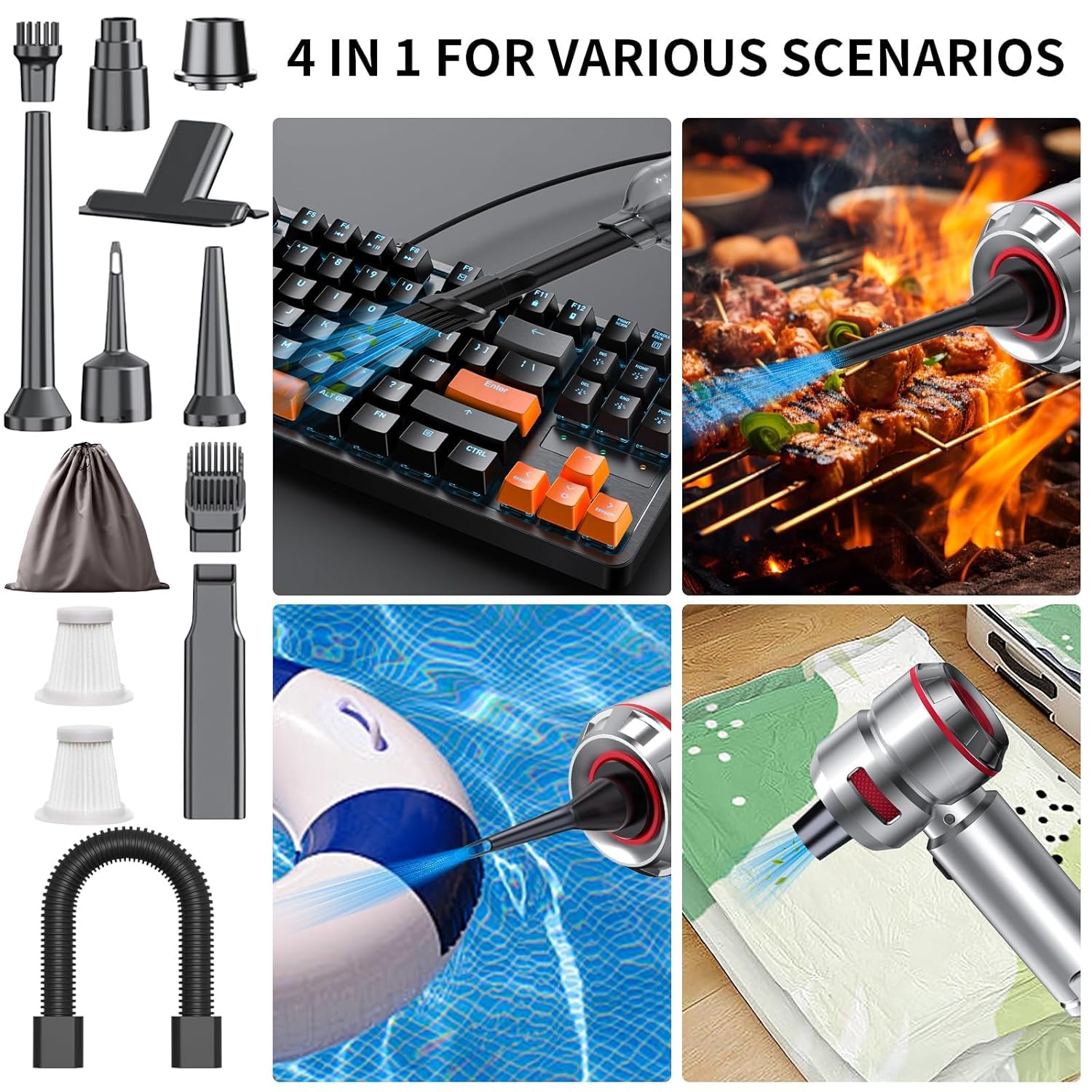 Apresentamos o Aspirador de Carro Portátil de Alta Potência – 22000PA, um equipamento multifuncional que se destaca pela sua versatilidade e eficiência. Este aspirador portátil 4 em 1 combina as funções de aspiração, sopro, bombeamento e insuflação, tornando-se um aliado indispensável no seu dia a dia. Com ele, você pode facilmente remover poeira e detritos do interior do seu carro, utilizar como soprador para secar superfícies, comprimir sacos para otimizar espaço e até mesmo inflar itens como boias de piscina em questão de minutos.