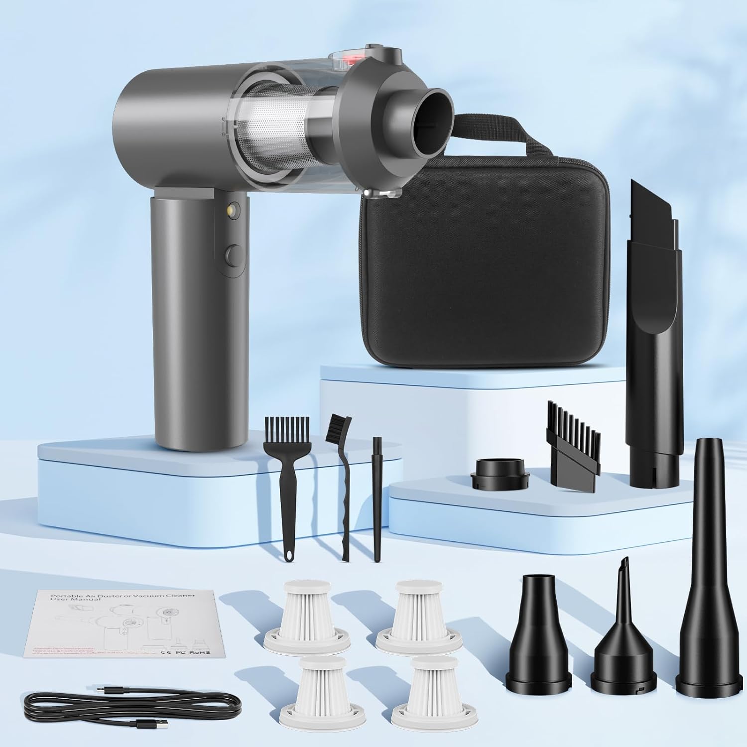 3 em 1 Multifuncional: Equipado com um filtro metálico e quatro filtros HEPA laváveis e reutilizáveis, este aspirador é capaz de filtrar 99,99% da poeira, garantindo um ambiente mais limpo e saudável. Acompanha um bico de sucção para limpeza rápida e eficiente de cantos, além de dois bicos de inflação para encher anéis de natação e balões, e um bico de bomba de sucção para sacos de armazenamento a vácuo.