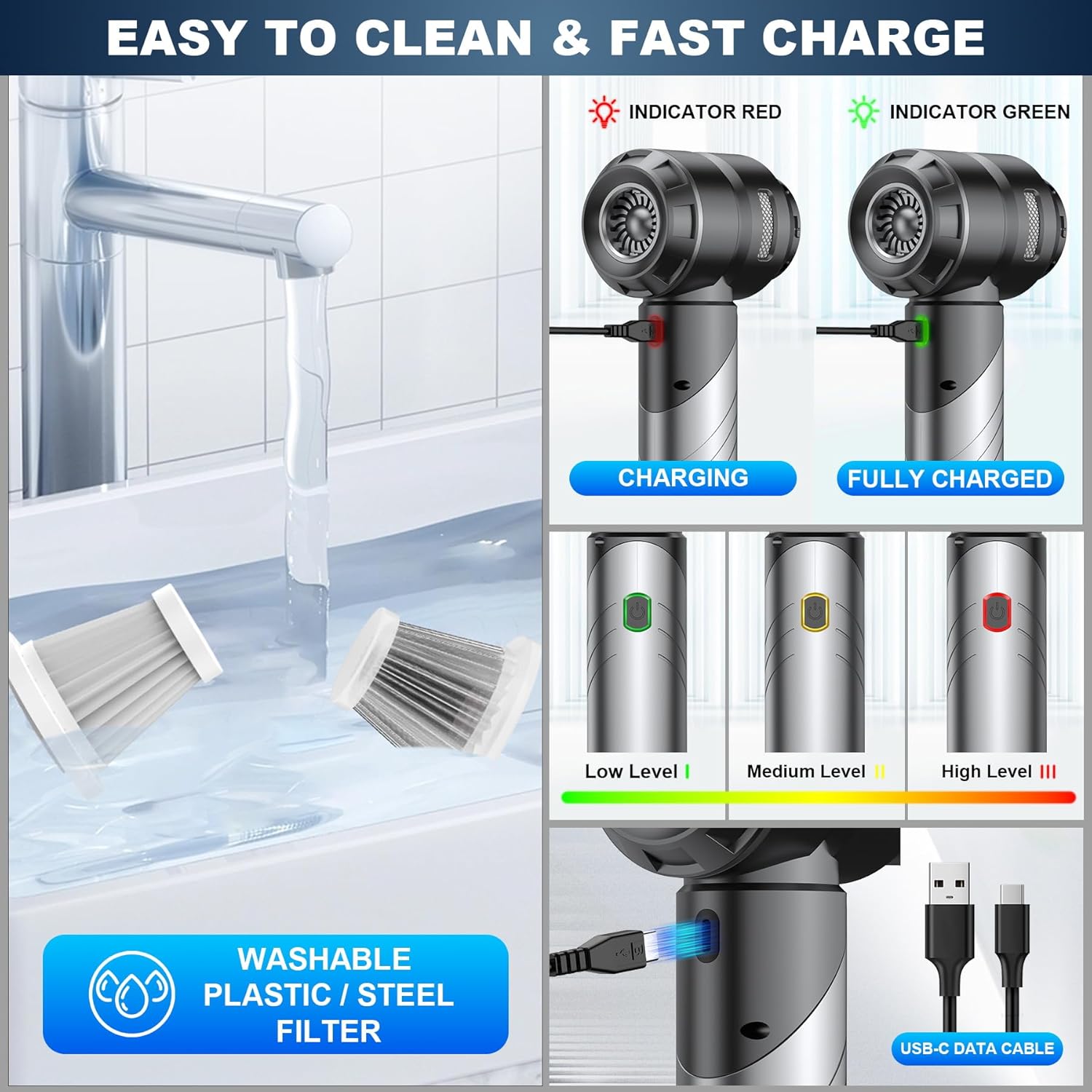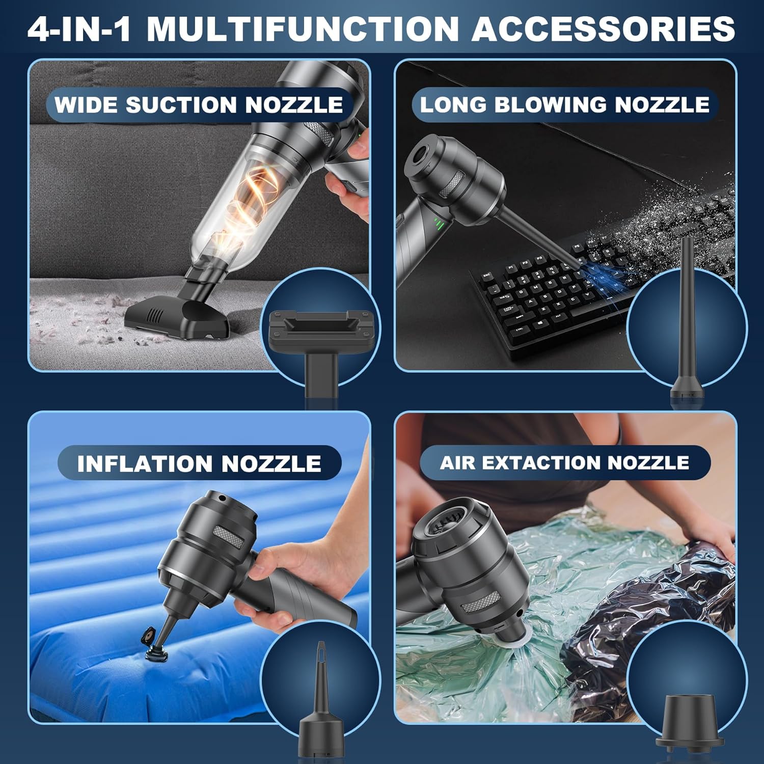 Este aspirador portátil é uma verdadeira revolução na limpeza. Com uma potente sucção, ele é perfeito para remover pelos de animais de estofados, sujeira de interiores de carros e poeira de teclados de computador. Sua função de sopro permite a limpeza de superfícies delicadas, enquanto a capacidade de inflar boias e colchões de ar o torna um aliado indispensável em qualquer situação.