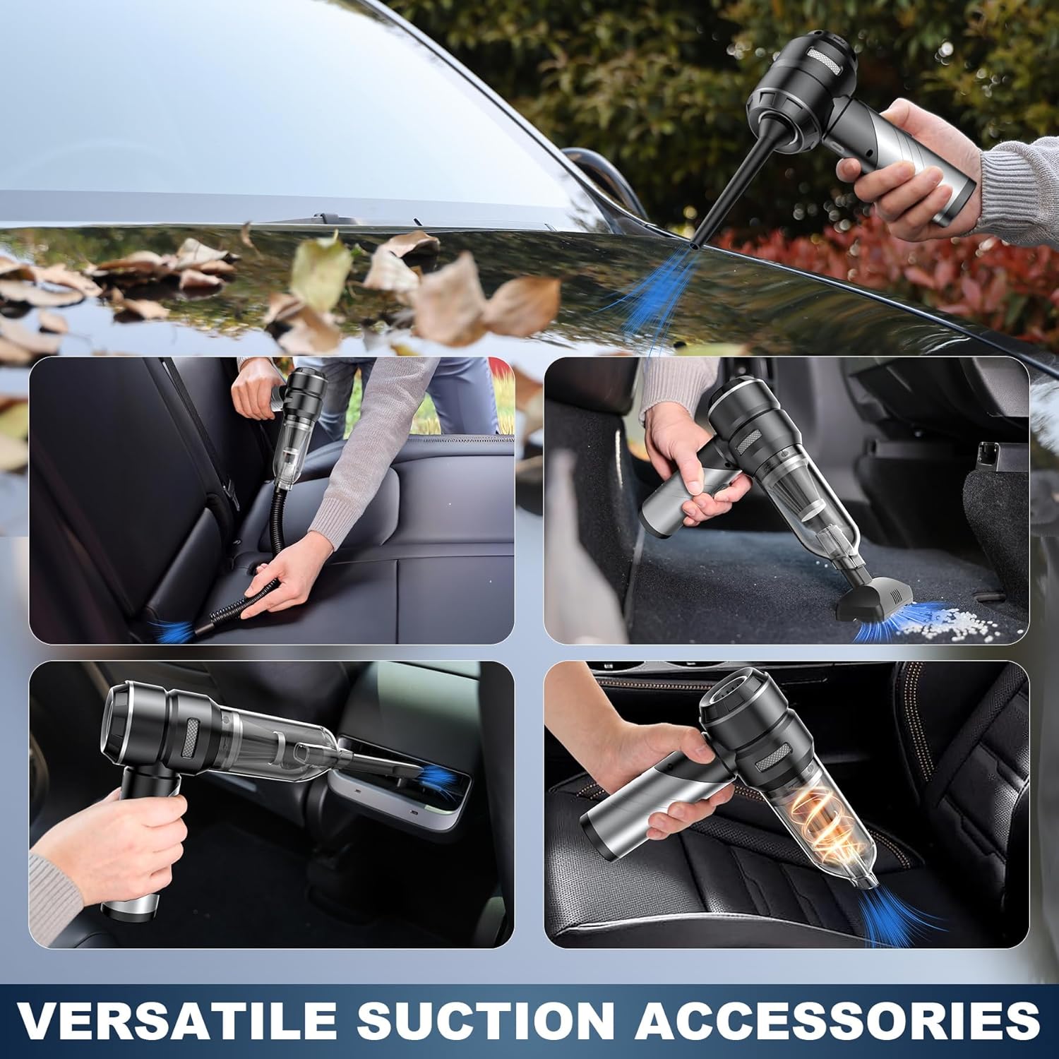Apresentamos o Aspirador de Carro Portátil Sem Fio com Sucção de 18000Pa e Função 4 em 1. Este aspirador inovador combina potência e versatilidade, tornando-se a solução ideal para quem busca um equipamento prático e eficiente para limpeza de veículos e ambientes. Com um design multifuncional, ele não apenas aspira sujeira e detritos, mas também atua como soprador, inflador e compressor, atendendo a diversas necessidades de limpeza e organização.
