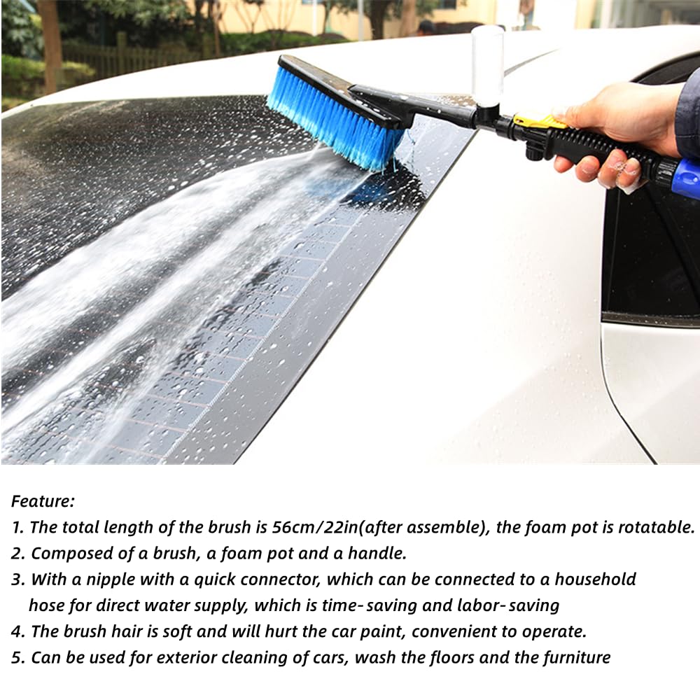 A escova é equipada com cerdas macias que garantem uma limpeza eficaz sem danificar a pintura do carro. Sua operação é descomplicada, permitindo que qualquer pessoa possa utilizá-la sem dificuldades. A combinação da escova, do pote de espuma e do cabo é feita com materiais de alta qualidade, garantindo durabilidade e eficiência. O cabo é ajustável e a escova possui um comprimento total de 56 cm (22 polegadas) após a montagem, ideal para alcançar todas as áreas do veículo.