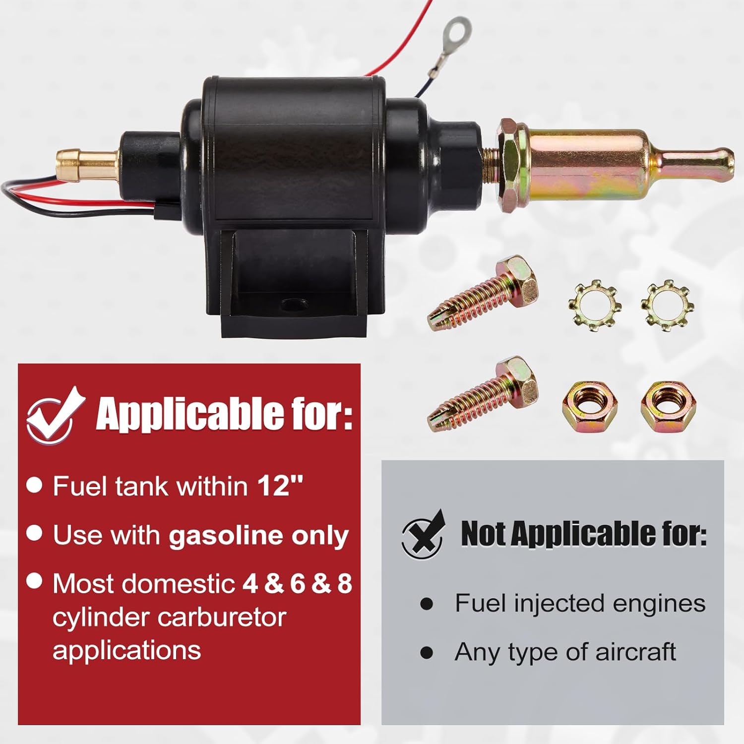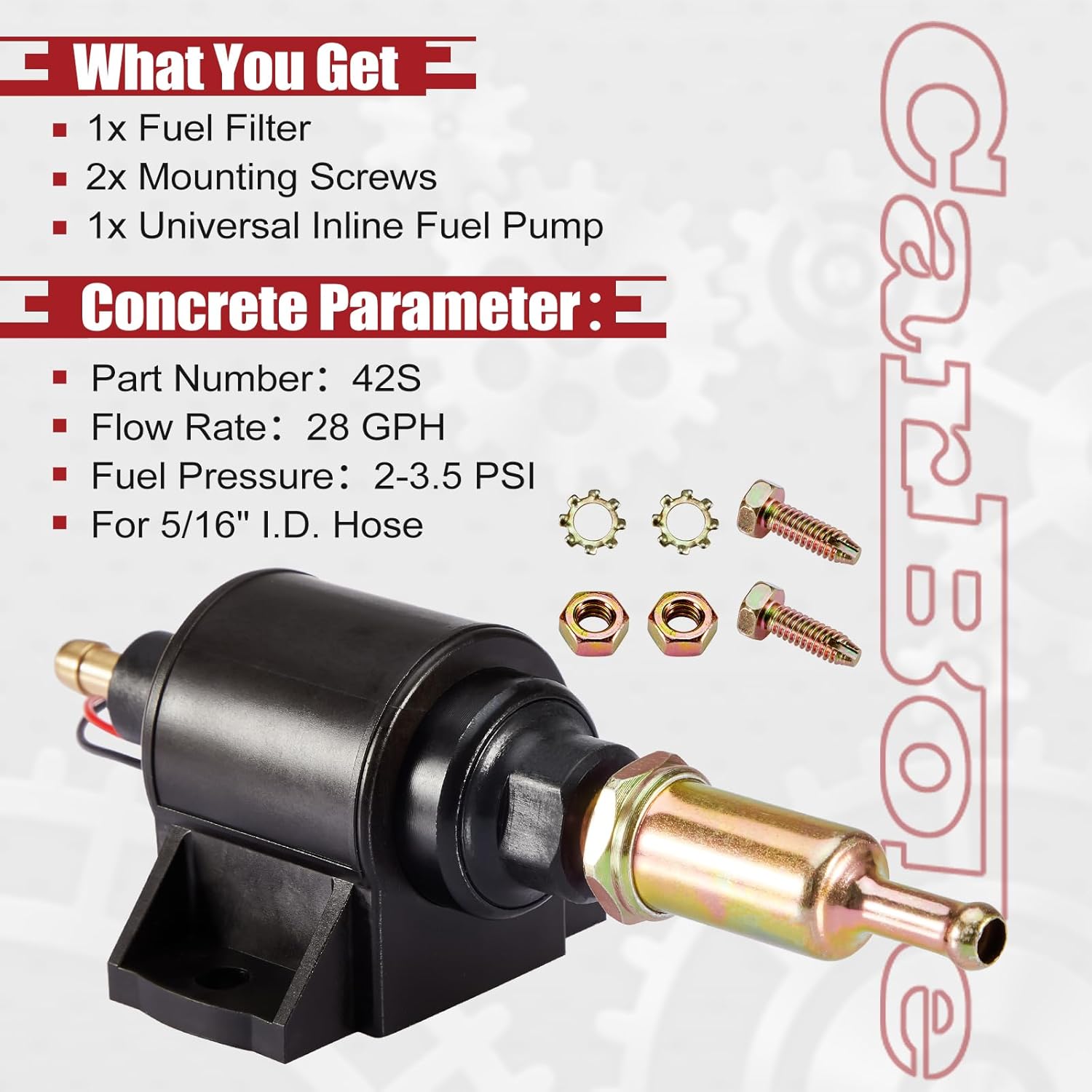 Aplicação Ampla: Esta bomba elétrica é compatível com todos os carburadores ou geradores que operam com 12 volts, tornando-a uma escolha versátil para carros, caminhões, barcos e até cortadores de grama. O número de intercâmbio é 42S, facilitando a substituição em caso de necessidade.
