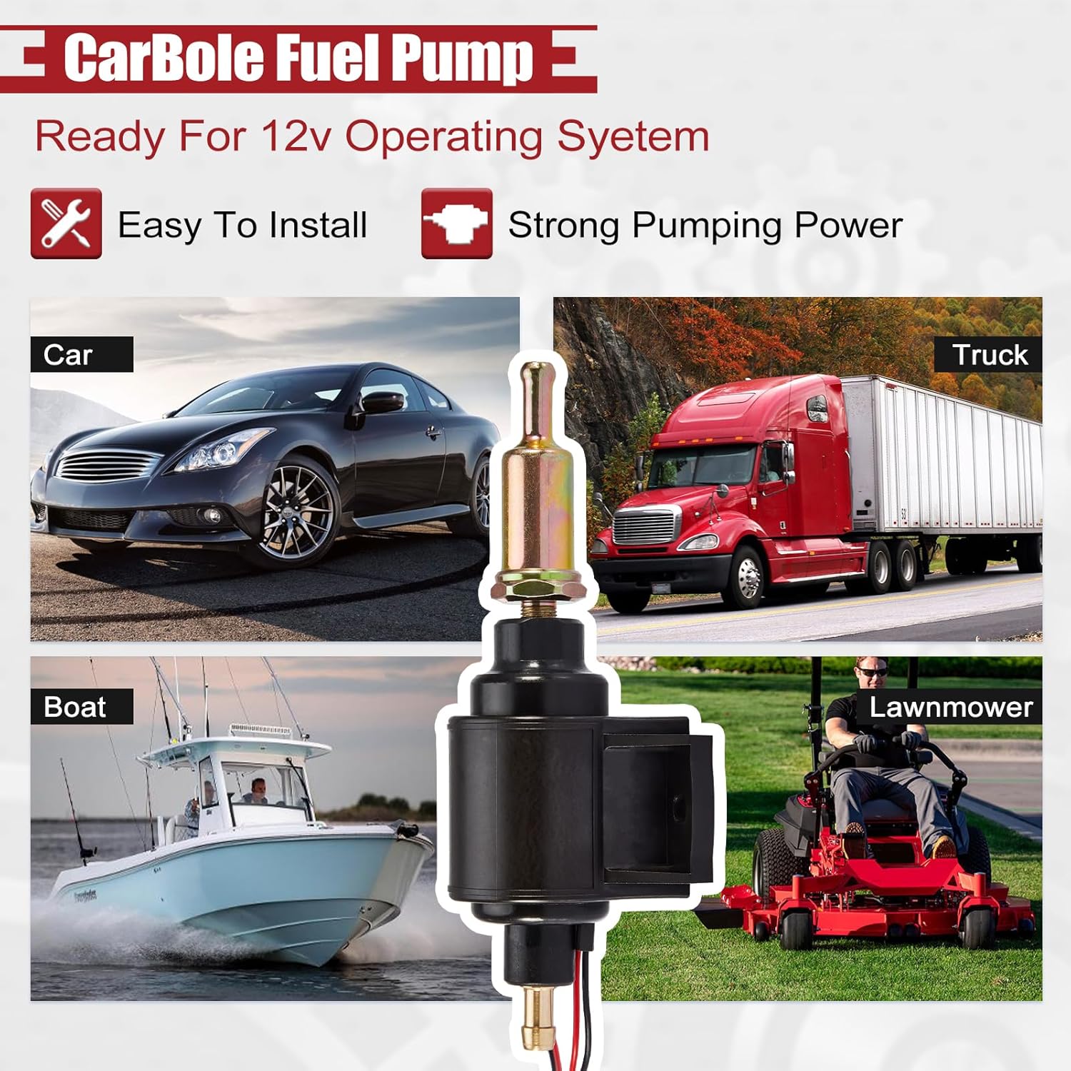 Observação Importante: A CarBole é compatível com gasolina, gasolina de corrida, diesel e outros combustíveis, mas não é adequada para combustíveis que contenham álcool, como E85 e etanol. Além disso, esta bomba universal não é projetada para motores com injeção de combustível.